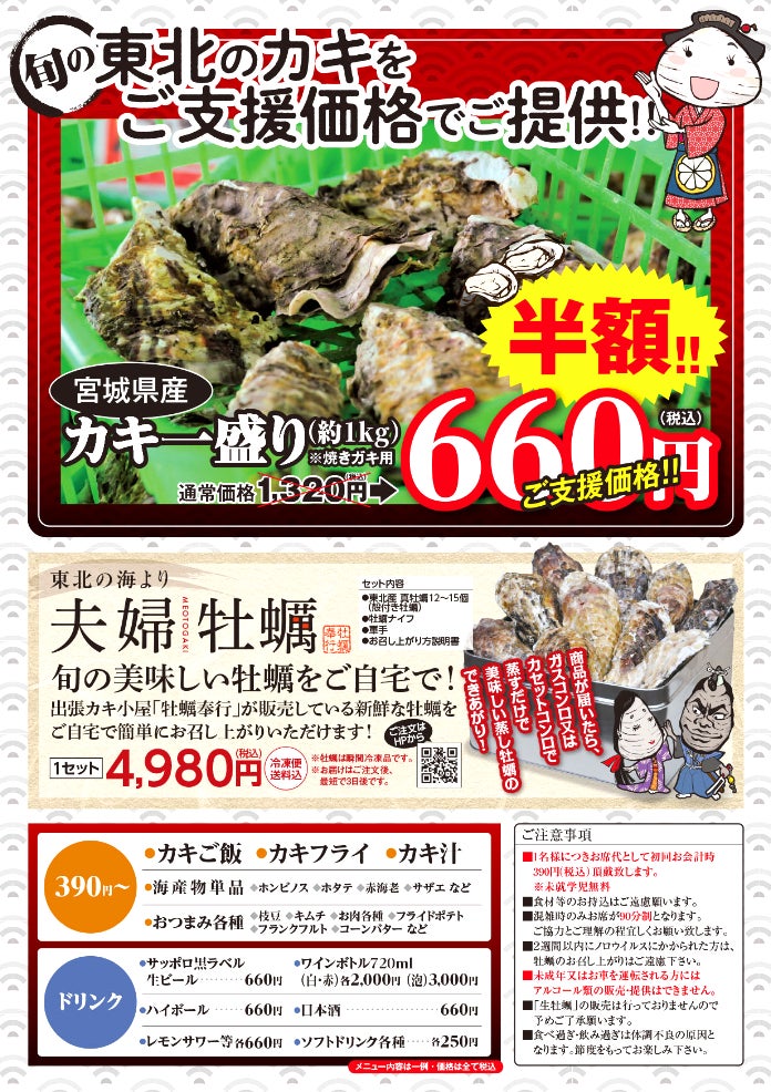 牡蠣ファンのために「大盛り石巻産殻付き真牡蠣」(約4キロ=殻付き約18個)通常2,640円を東北復興支援価格として1つ1,980円で提供する。