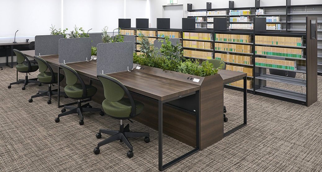 落ち着いたダークブラウンの家具を基調に、読書や学修に集中しやすい空間に。