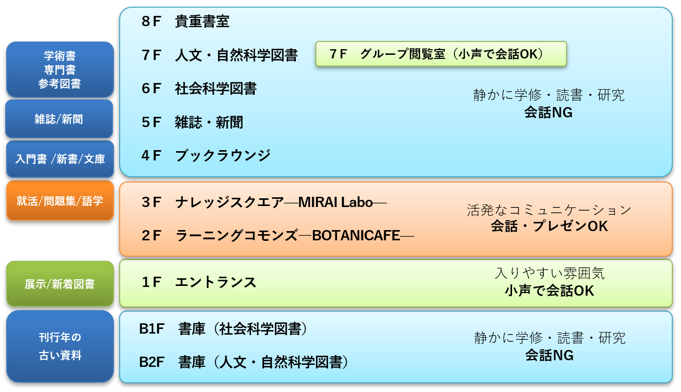 2025年4月にリニューアル済みの1Fフロアと、既存の他フロアも併せて全館的なゾーニングを行い、目的に応じて柔軟にフロアの使い分けができるようになりました。約67万冊の蔵書とオンラインリソースも活用し、学生・教職員の学びや研究をサポートします。