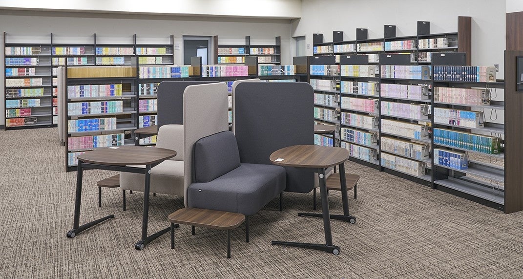 書架と椅子を有機的に組み合わせ、くつろぎながら気軽に図書館資料に触れられる空間へ。学生向けコレクション “亜大ラベル”や新書・文庫本などをリニューアル後のフロアに配置し、読書習慣の定着を狙う。