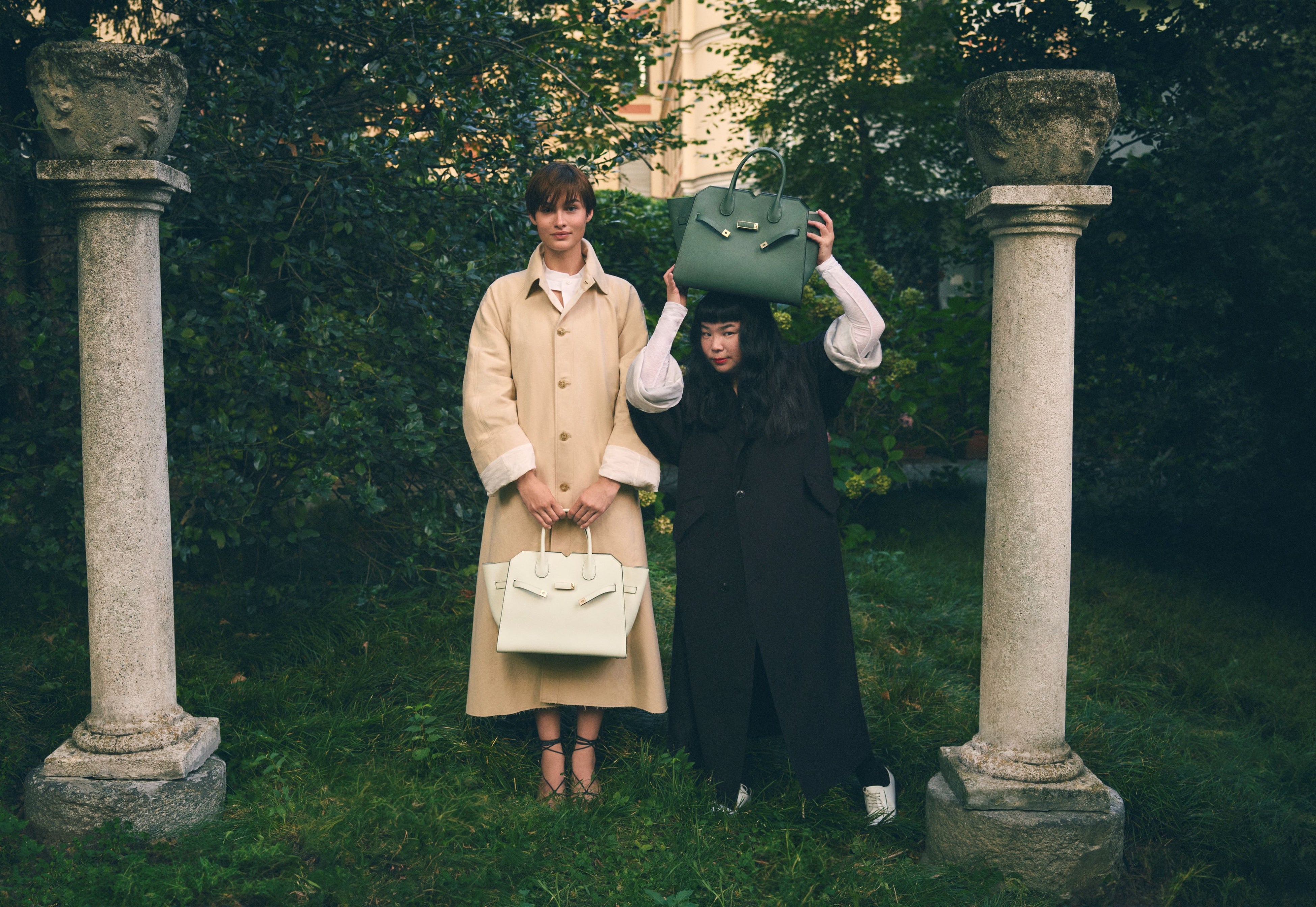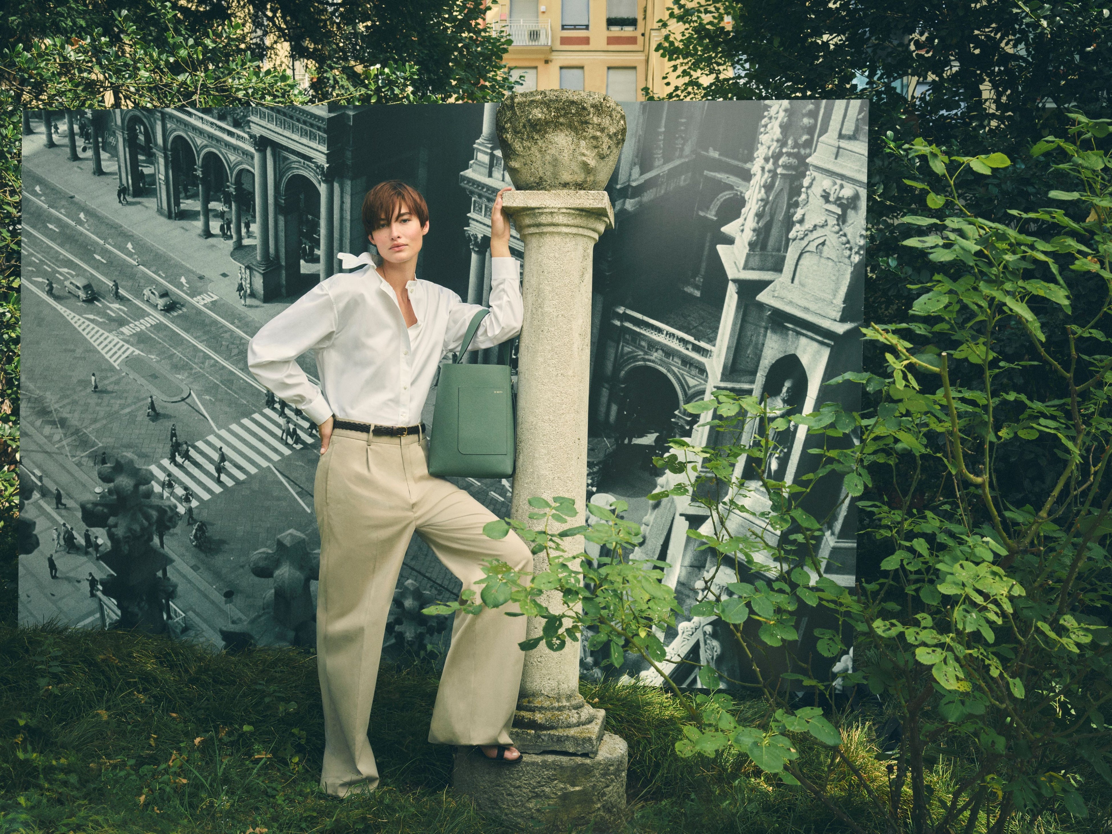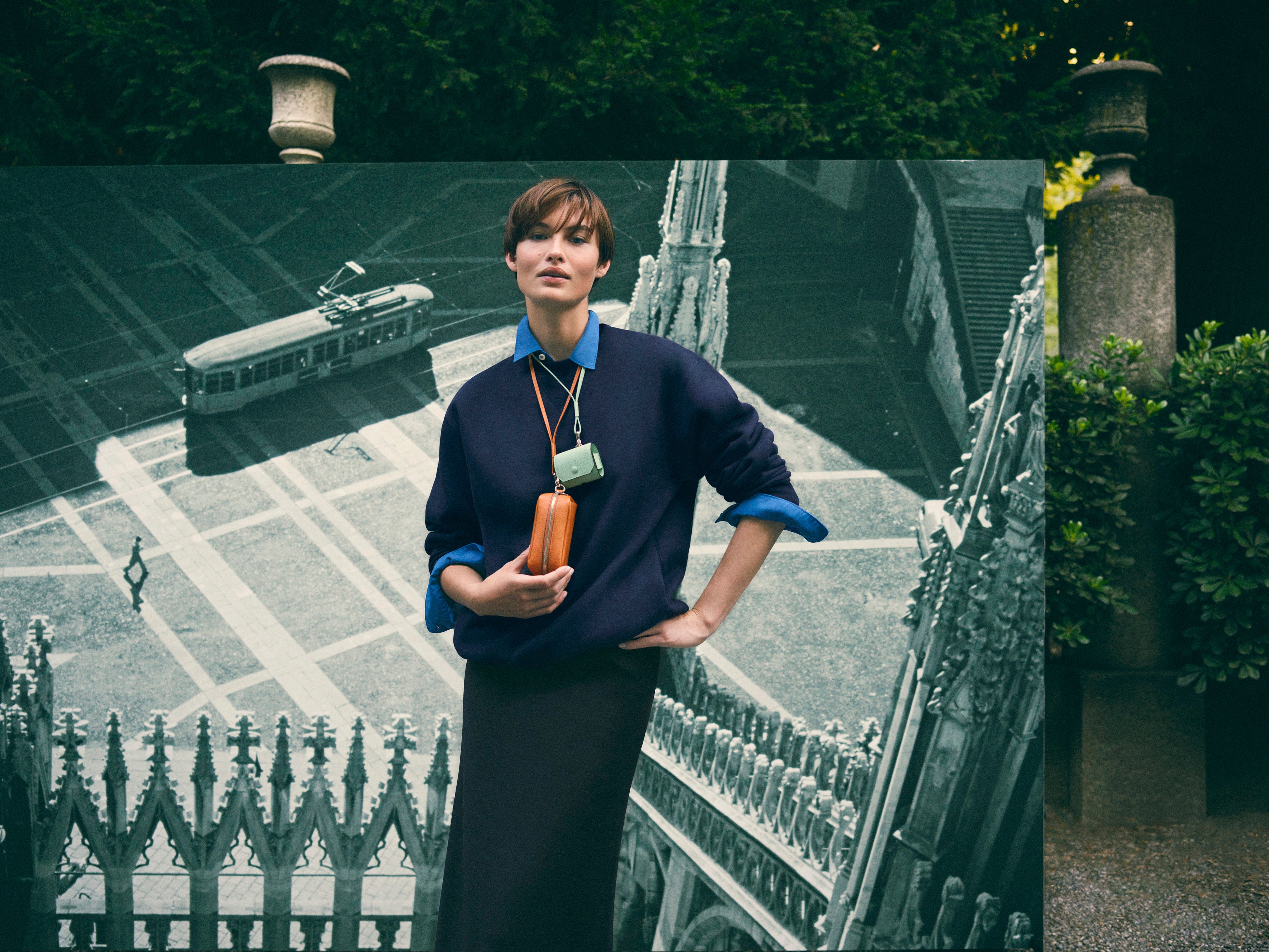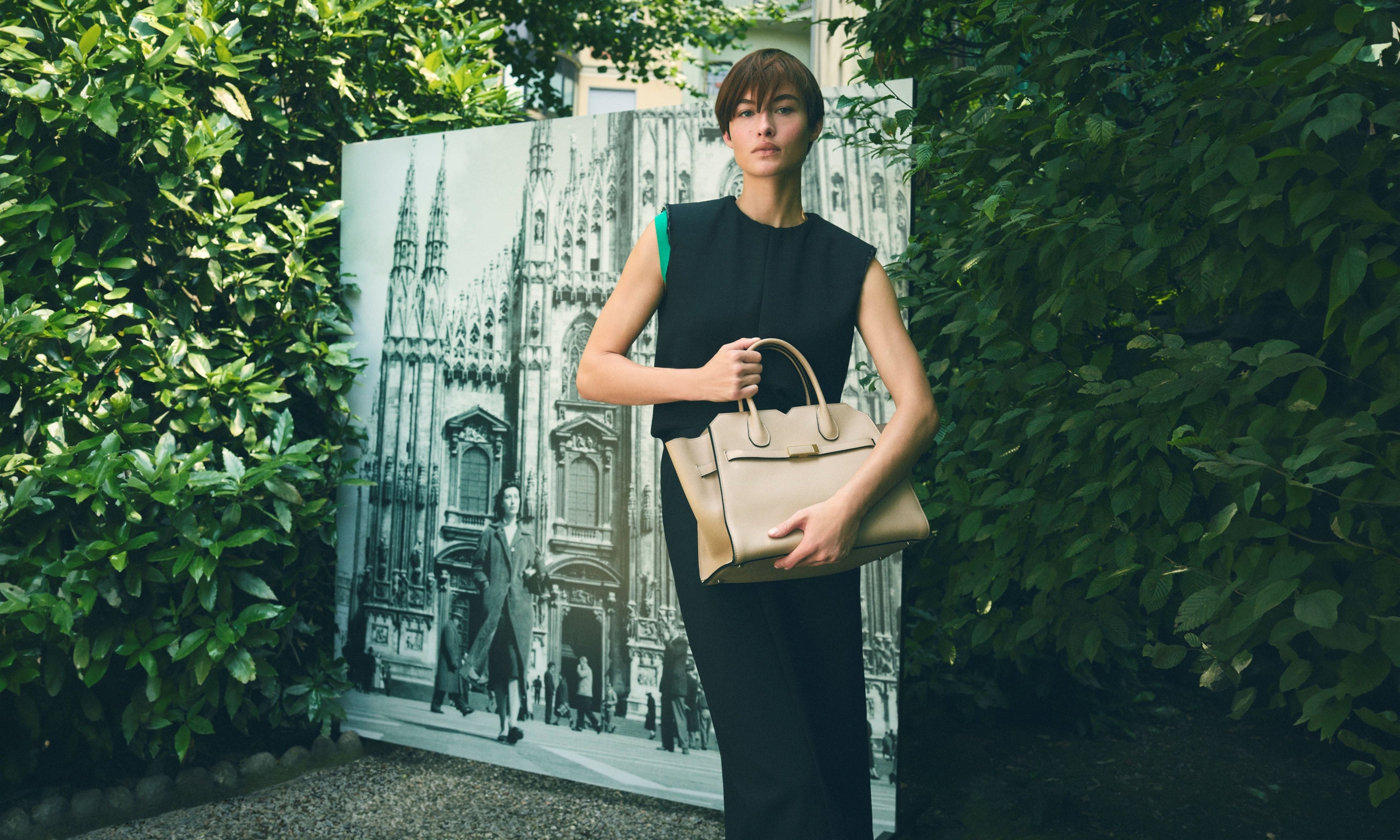 スーパーモデルのグレース・エリザベスの手にある新しい「ミラノバッグ」とアイコニックな「イジィデ」は、街のランドマークや秘密の庭園を探索し、場所と人の両方を主人公に、言葉を発せずとも多くを語る絶え間ない対話を繰り広げています。