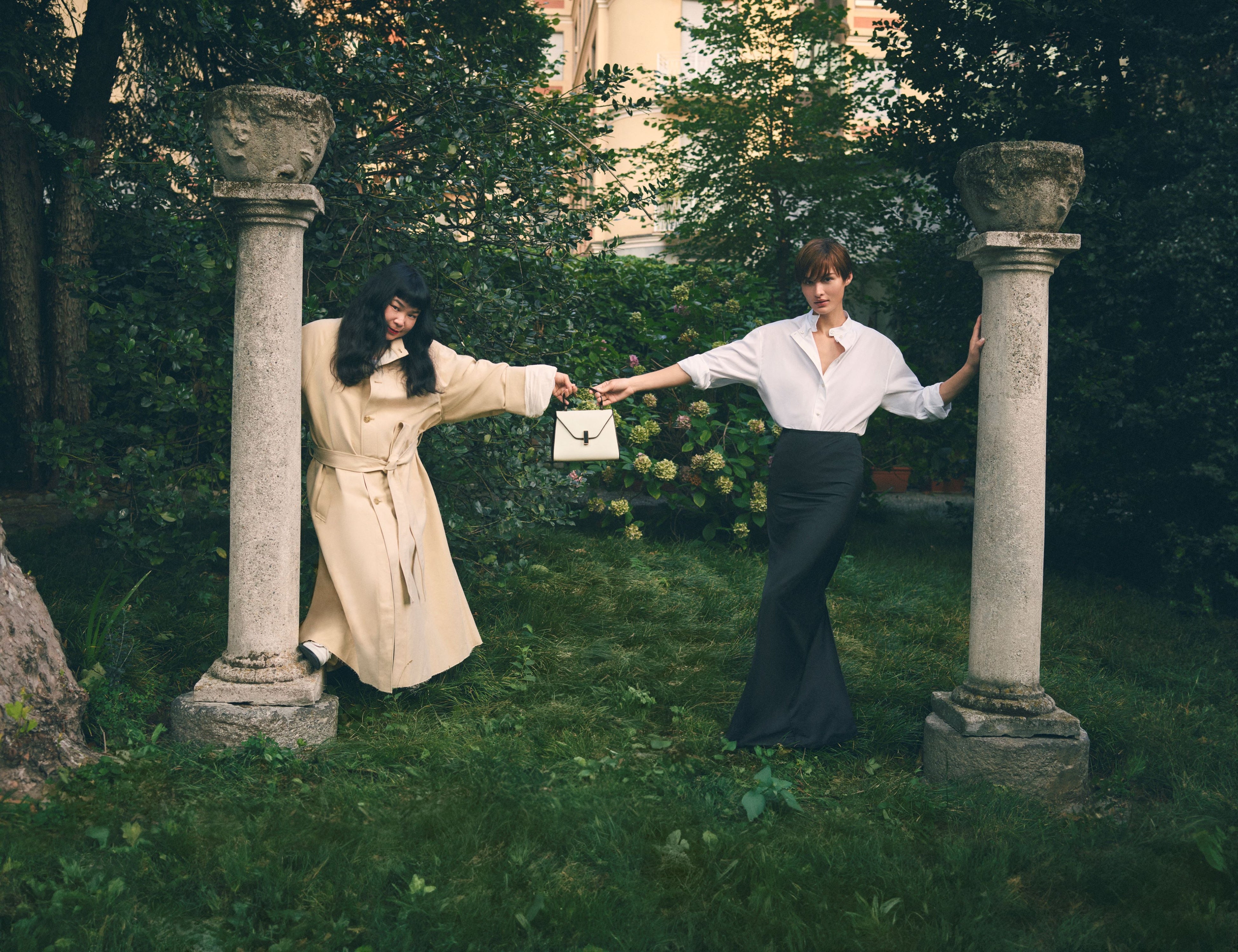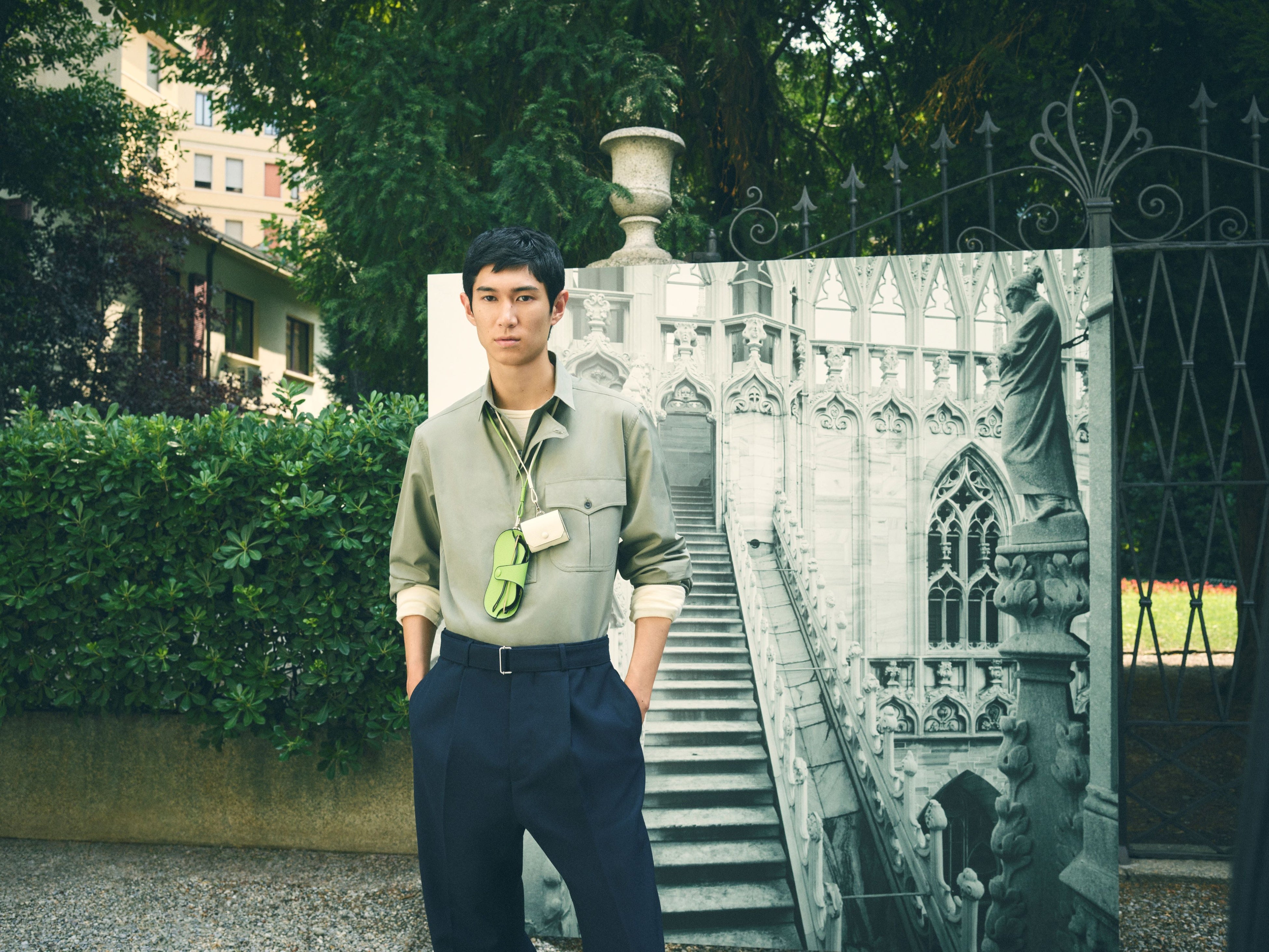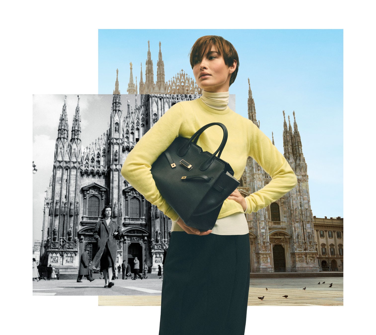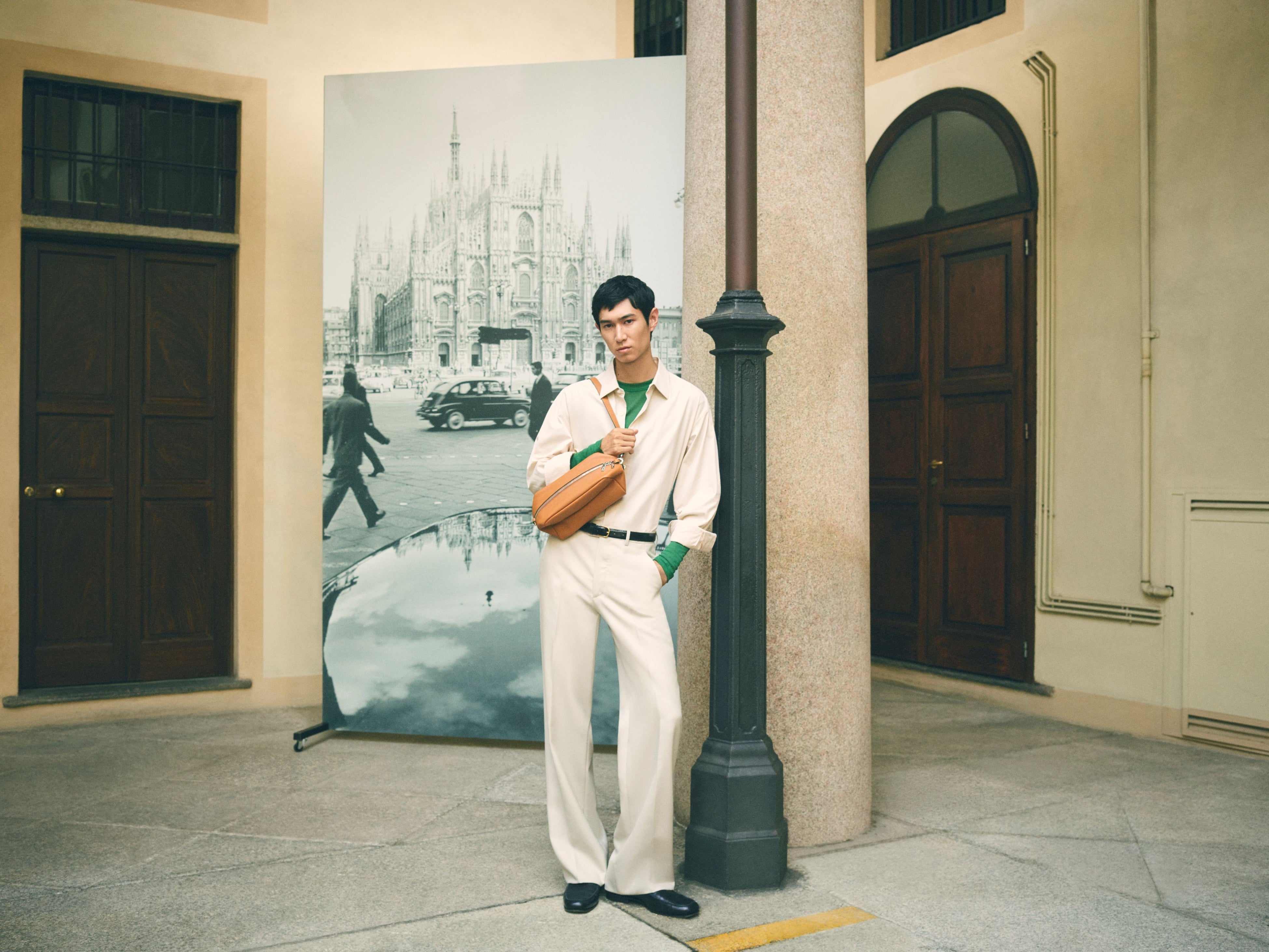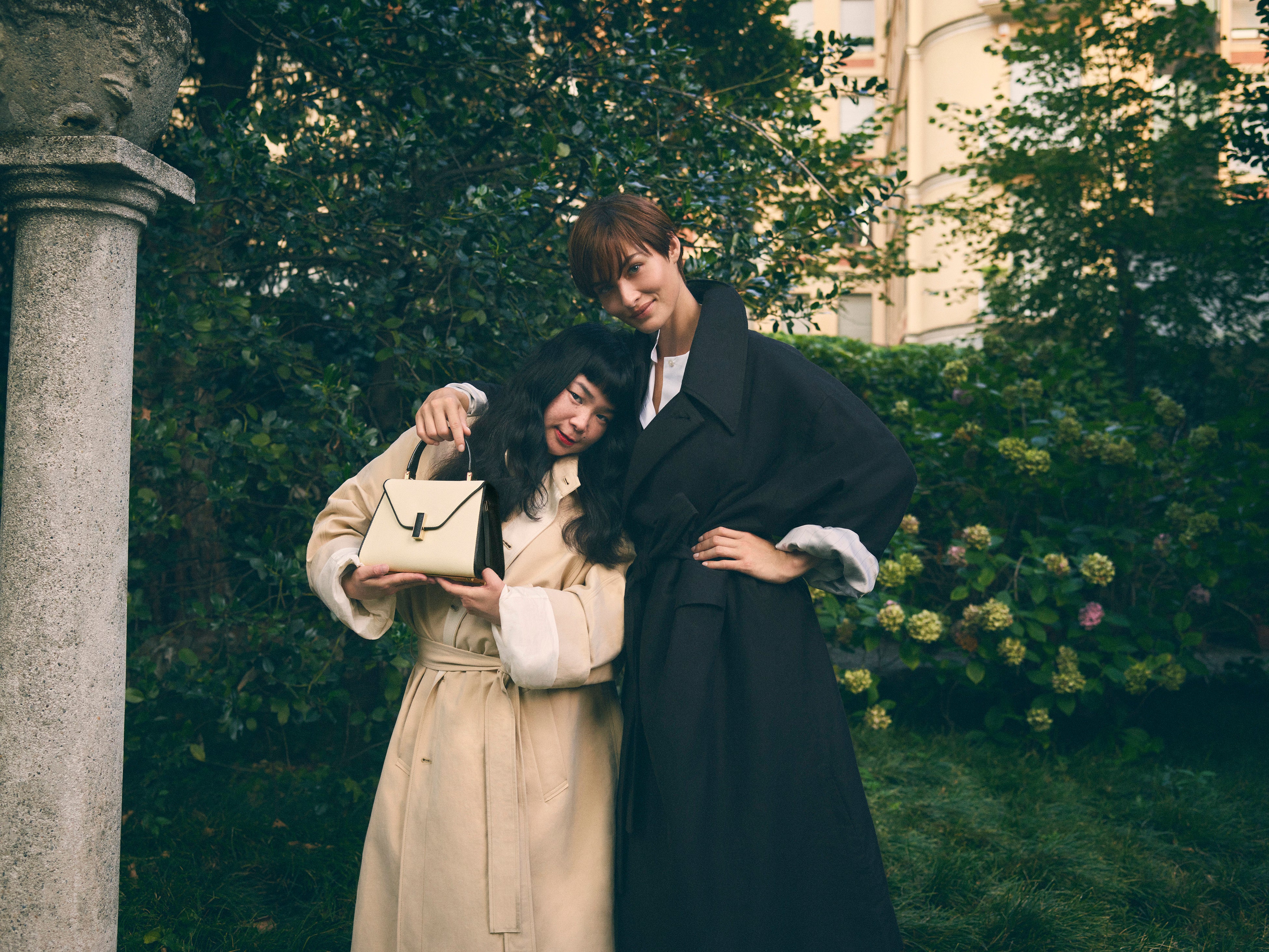 スーパーモデルのグレース・エリザベスの手にある新しい「ミラノバッグ」とアイコニックな「イジィデ」は、街のランドマークや秘密の庭園を探索し、場所と人の両方を主人公に、言葉を発せずとも多くを語る絶え間ない対話を繰り広げています。