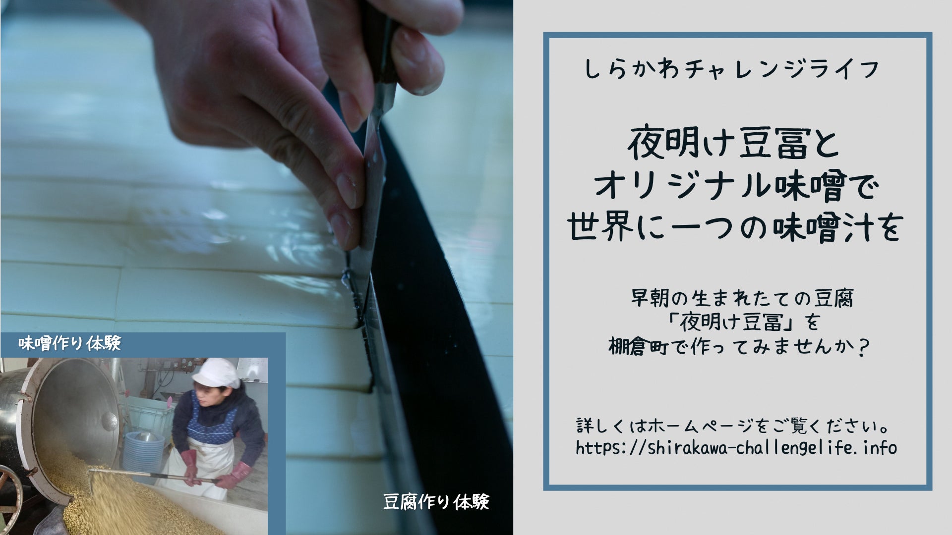 福島県しらかわ地域で“あなただけ”の短期移住体験を!早朝の生まれたての豆富とオリジナル味噌で世界に一つだけの味噌汁を作りませんか?