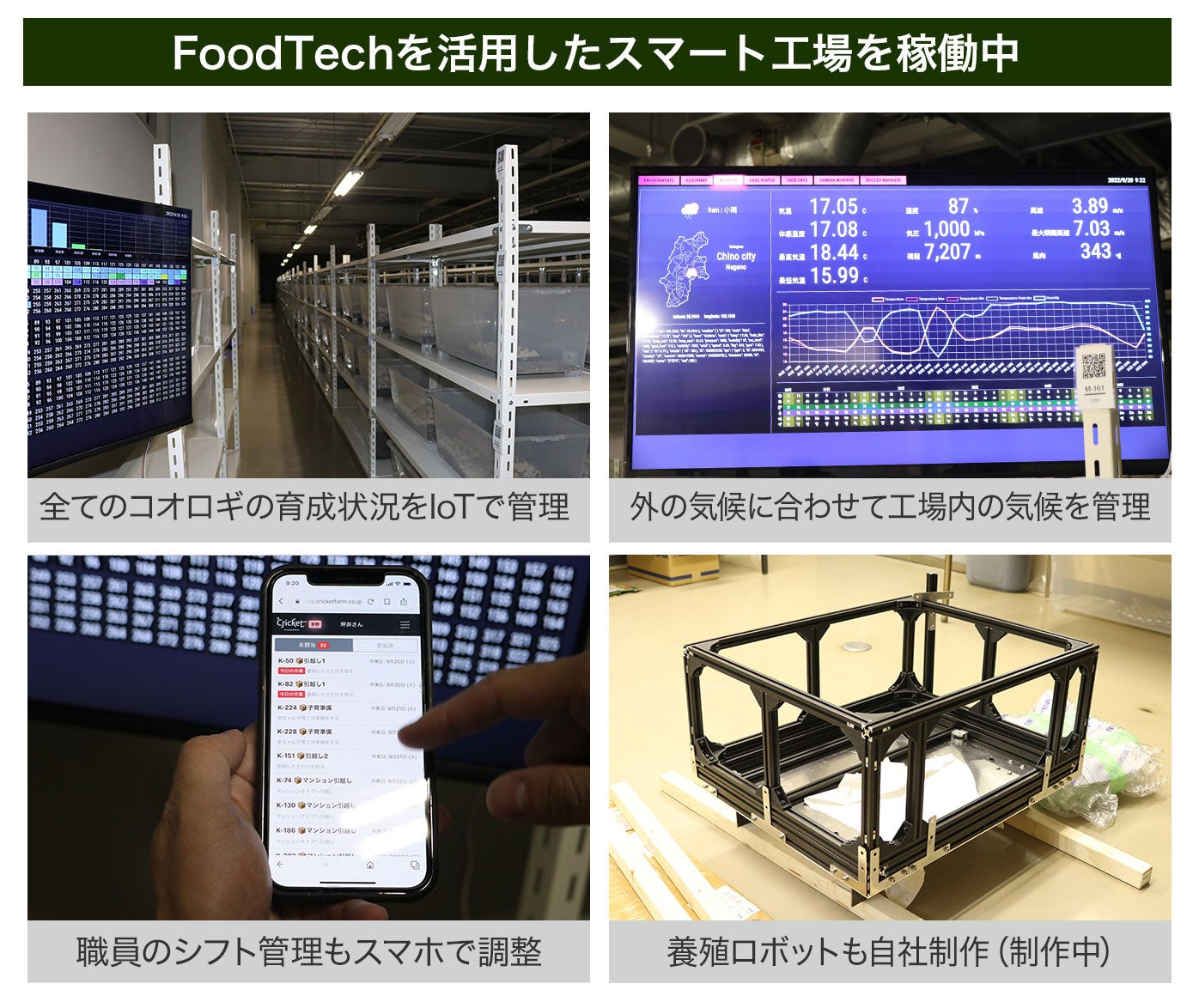 これに対し私たちは、コオロギの養殖を間近で見られる工場見学を実施し、食用コオロギへのイメージアップを図るとともに、センシング技術やアプリ活用による独自のスマート養殖システムを確立することで、効率化・省力化・省人化を図り、国産コオロギパウダーの低価格化を実現。今後は、コオロギパウダーの流通拡大に向け、スマート養殖生産システムを世界中の企業へ提供することでサプライチェーンの強化も図る計画です。