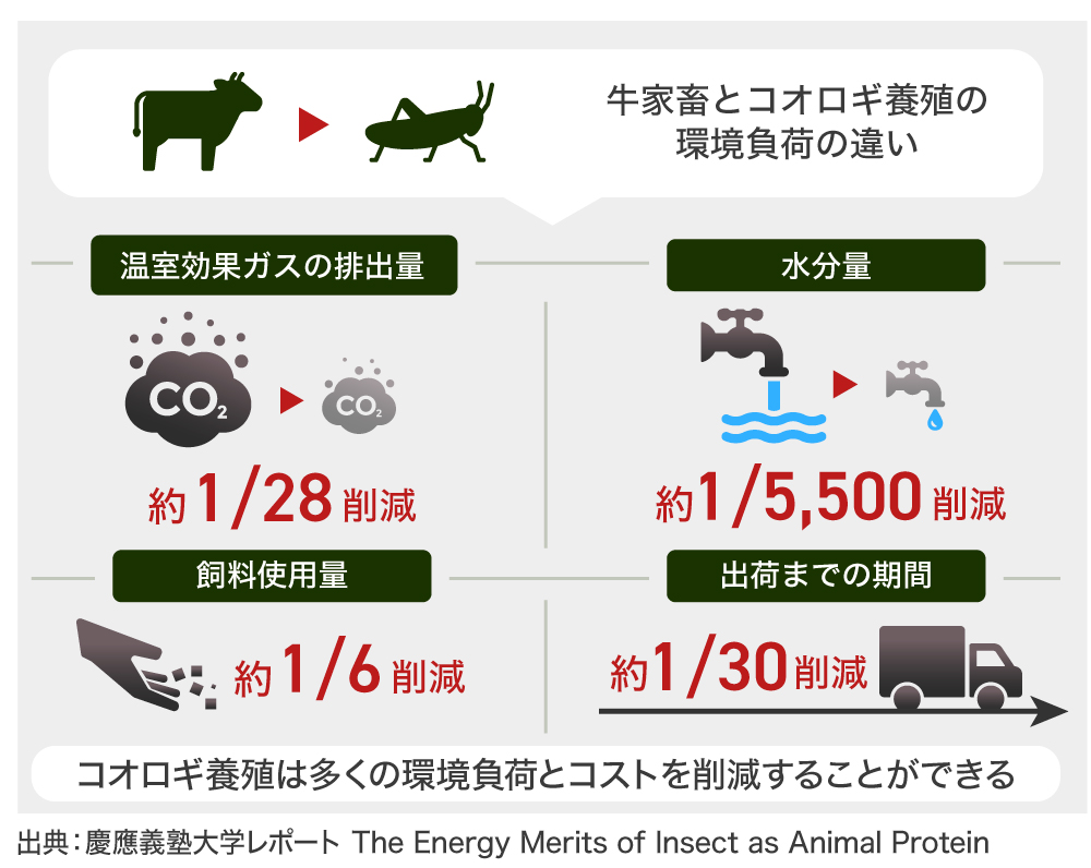 私たちが生産をしている食用コオロギは、牛や豚といった他の畜産に比べて必要な水や餌の量が少なく済み、環境に負荷をかけずに飼育ができることから、SDGsの観点からも理にかなった食材といえます。