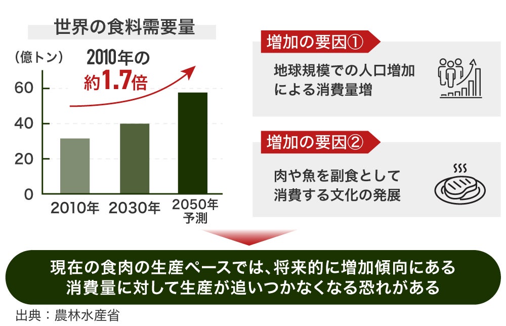 実際、農林水産省の発表では、2050年には世界の食料需要量が2010年の約1.7倍になるとも予想されており、タンパク質の供給不足問題は待ったなしで迫ってきています(出典:農林水産省)。