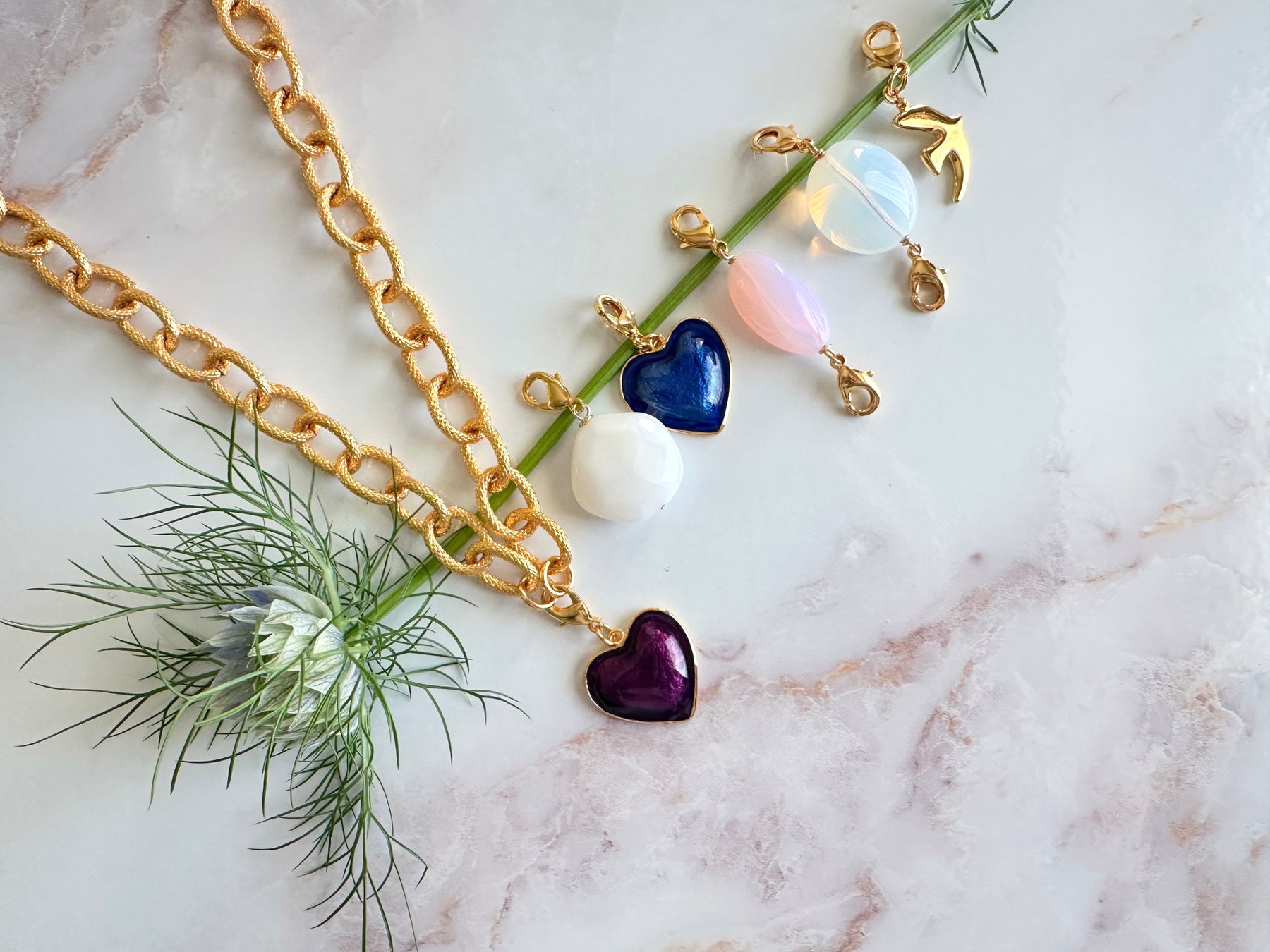 涼やかでスタイリッシュなシルバーカラーのネックレスチェーンに合わせて、チャームを変えて楽しめるガラスストーンやメタルのパーツも色とりどりにご用意し、ますますバリエーションが広がりました。メッシュチェーンのイヤリングやピアスとともにお楽しみください。