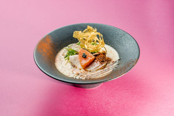 「フレンチ」×「サーモン」×「ラーメン」をコンセプトに、1匹のサーモンを頭から骨の髄までを使い、フレンチ歴14年の熟練の知識と技術で仕上げた、究極のサーモンラーメンをご堪能ください。