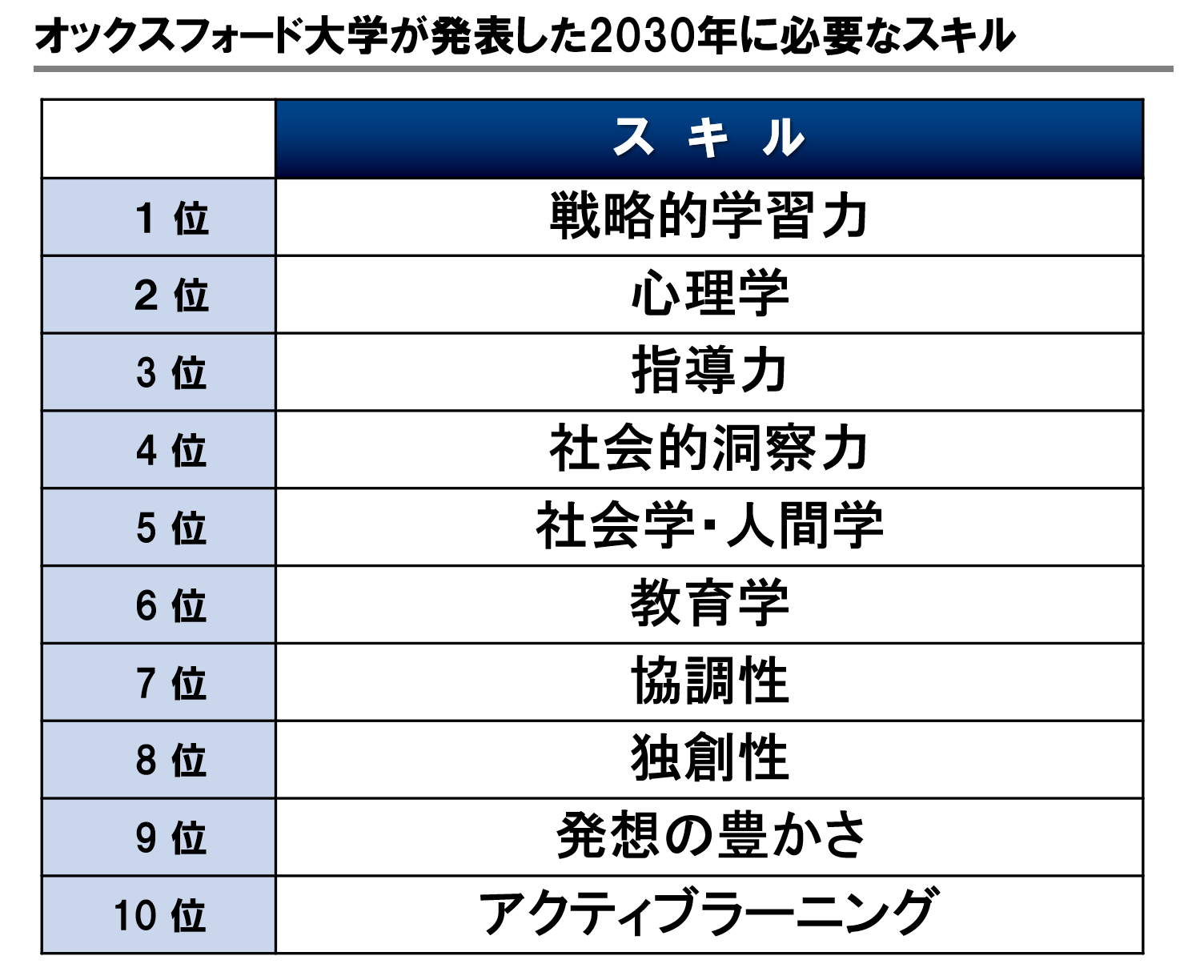 オックスフォード大学のマイケル・オズボーン氏が発表した【2030年に必要なスキルTOP10】が下記の通りです。(出典:The Future Skill : Employment in 2030)