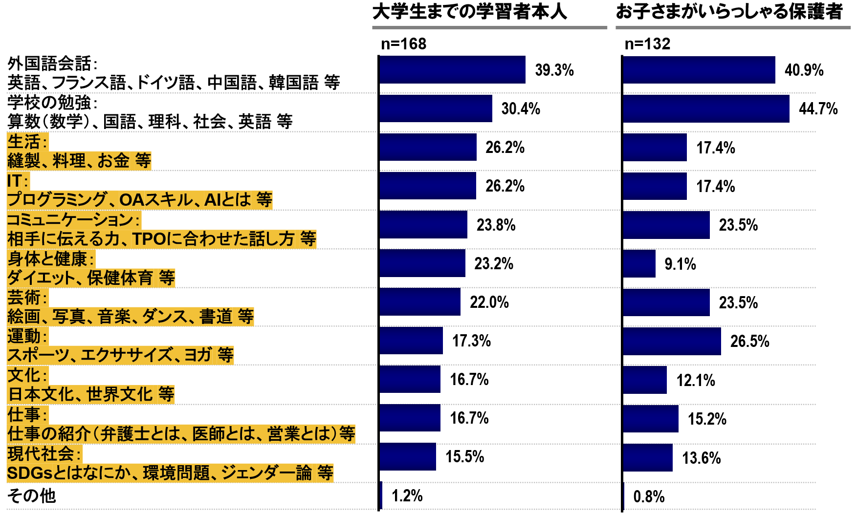実際に、ユアスタの生徒で登録をしてくださっている方には、学校の勉強や外国語の他、コミュニケーションやITなど、社会に出て役に立つスキルを学びたいと考えている方が半数以上いらっしゃいます。(アンケート調査より)