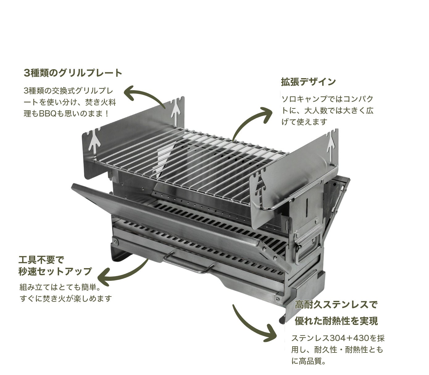 本製品は、「煙が目にしみる」「調理が限られる」「収納が大きくて不便」「地面を焦がしてしまう」といった焚き火台にありがちな課題を解決し、これまでにない、自由でスマートな焚き火体験を可能にする次世代モデルです。