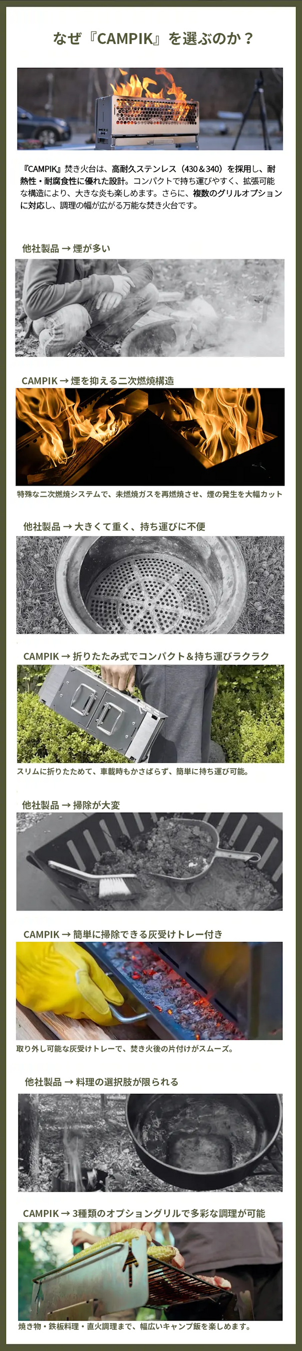海外のワクワクする商品を紹介するM&Y TRADE(北海道江別市)は、煙を抑える二次燃焼構造と、調理の幅が広がる3WAYグリルを備えた新型焚き火台『CAMPIK(キャンピック)』の先行予約販売を、2024年3月24日(月)よりクラウドファンディングサイトMakuakeにて開始しました。