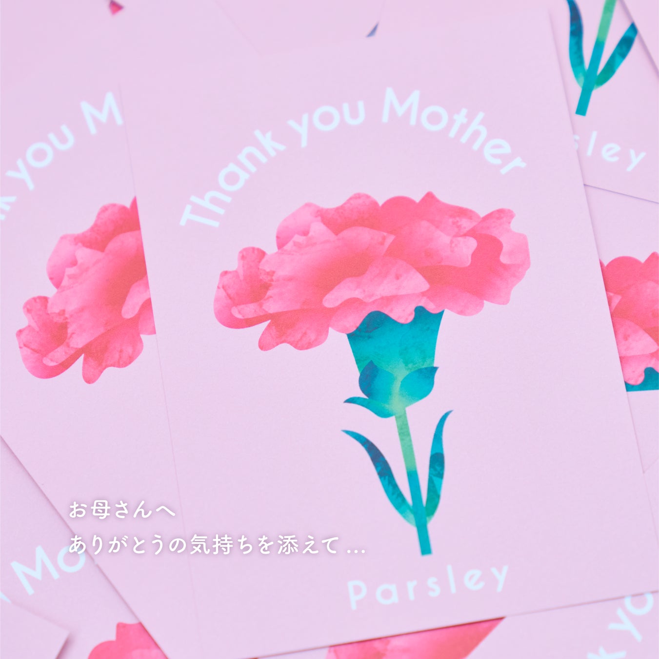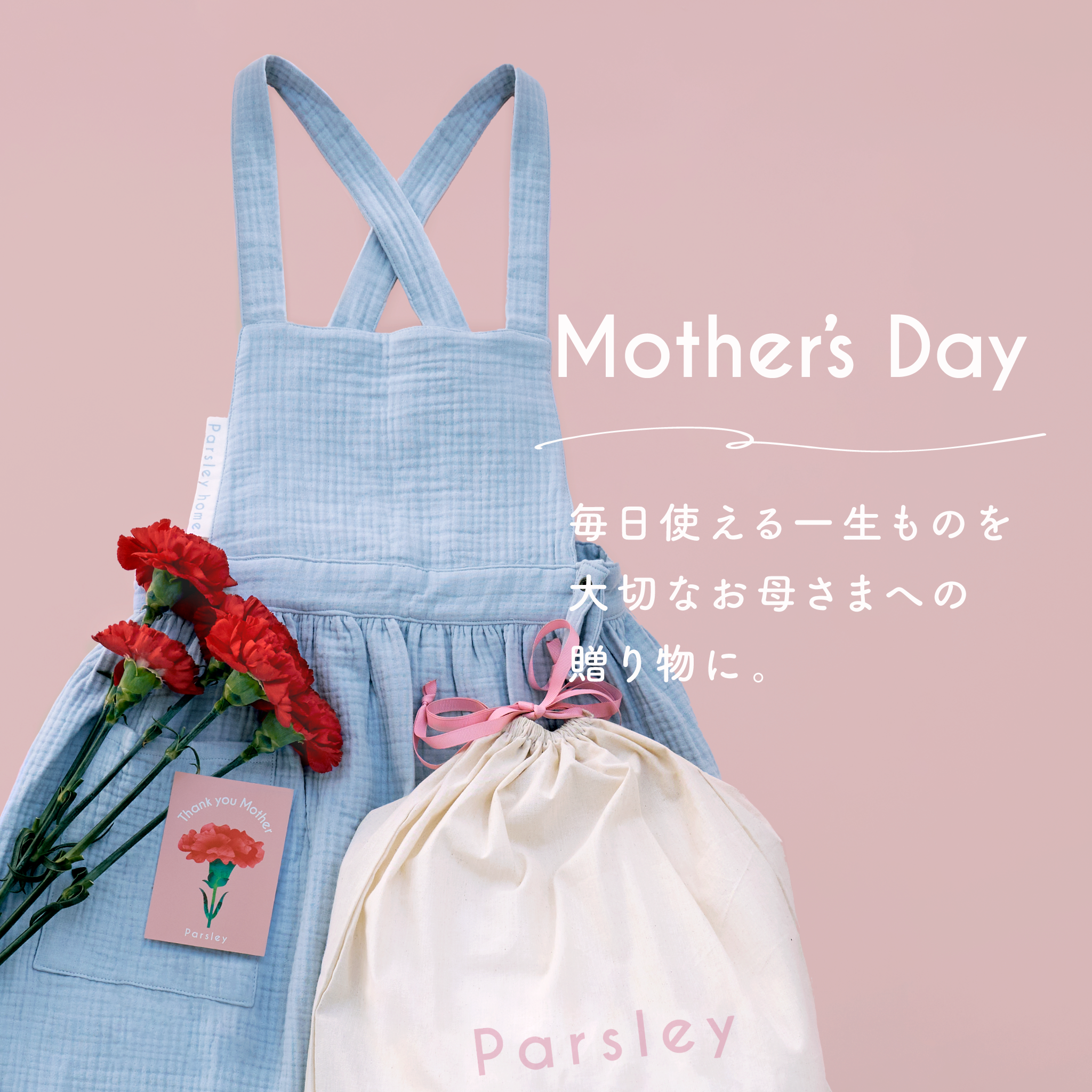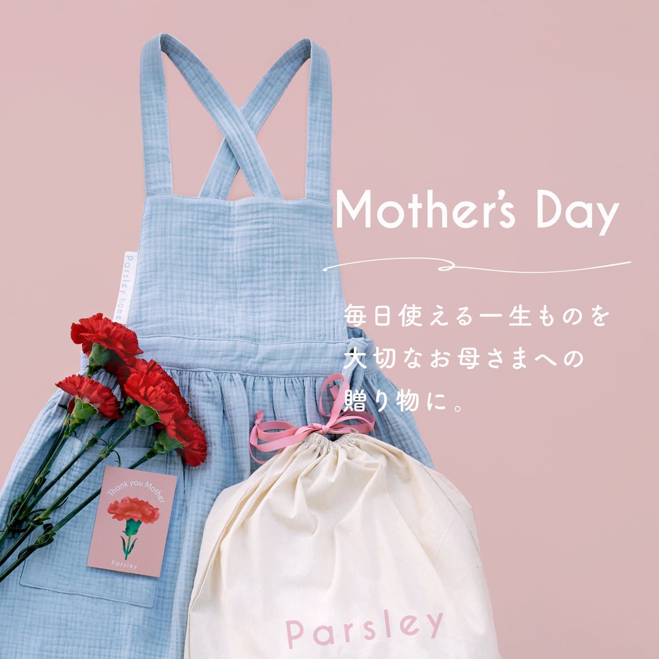 セットには、Parsleyのエプロンに加え、オリジナルのギフト巾着と、母の日限定のメッセージカードをお付けしています。