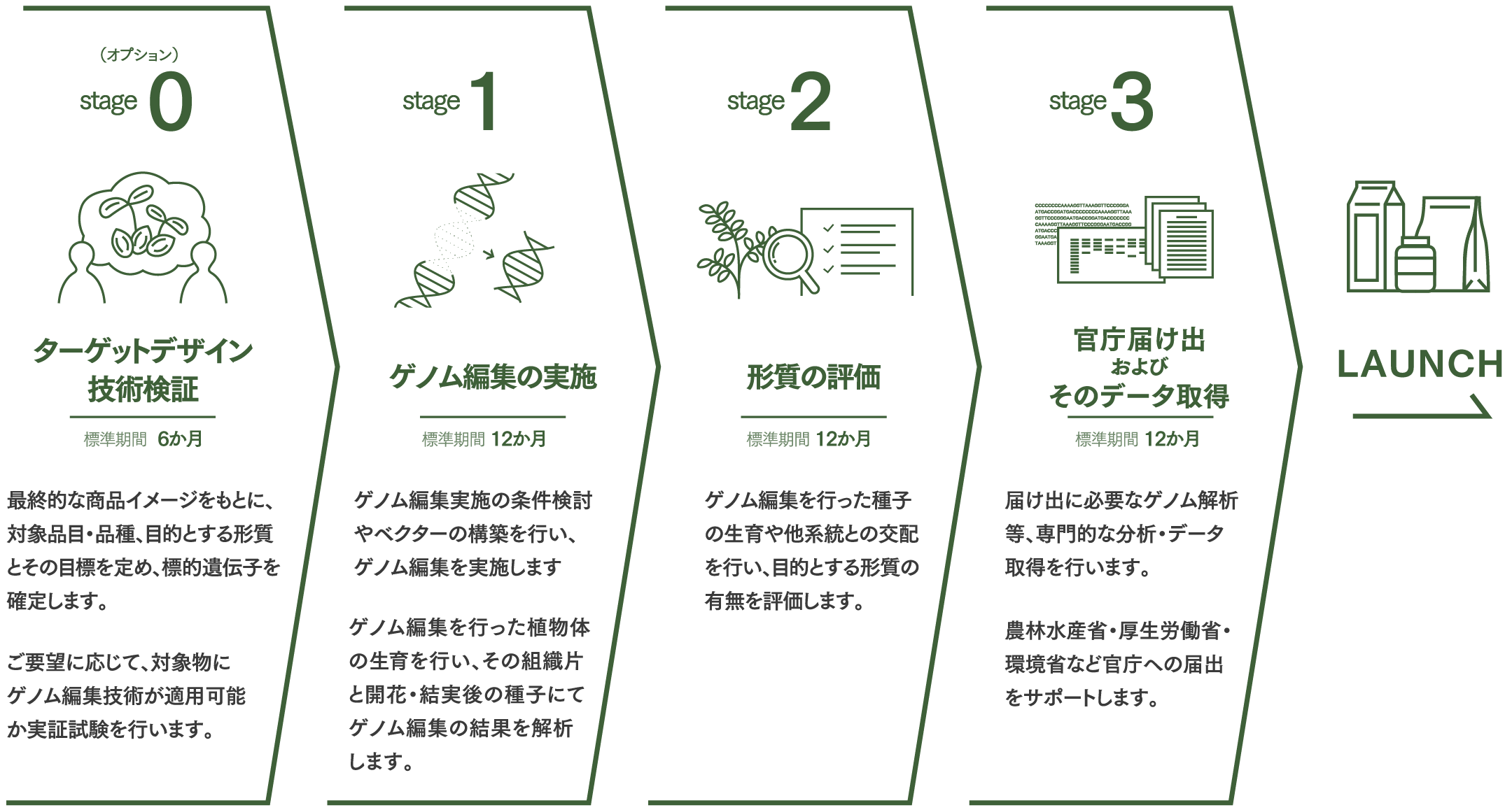グランドグリーンでは創業当初より、あらゆる作物・品種でゲノム編集技術を利用可能にするための技術標準化に取り組んでまいりました。これまでに植物のゲノム編集プラットフォーム技術(Gene App™および3GE™)を開発し、トマトを始めとした10種類以上の作物において、実用品種へのゲノム編集技術適用の実証に成功しています。現在グランドグリーンでは、このゲノム編集プラットフォーム技術を用いた新品種の開発を、パートナー企業との連携を通して積極的に実施しています。