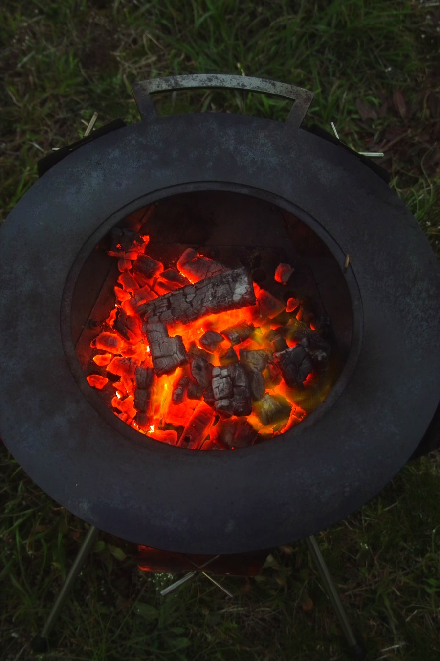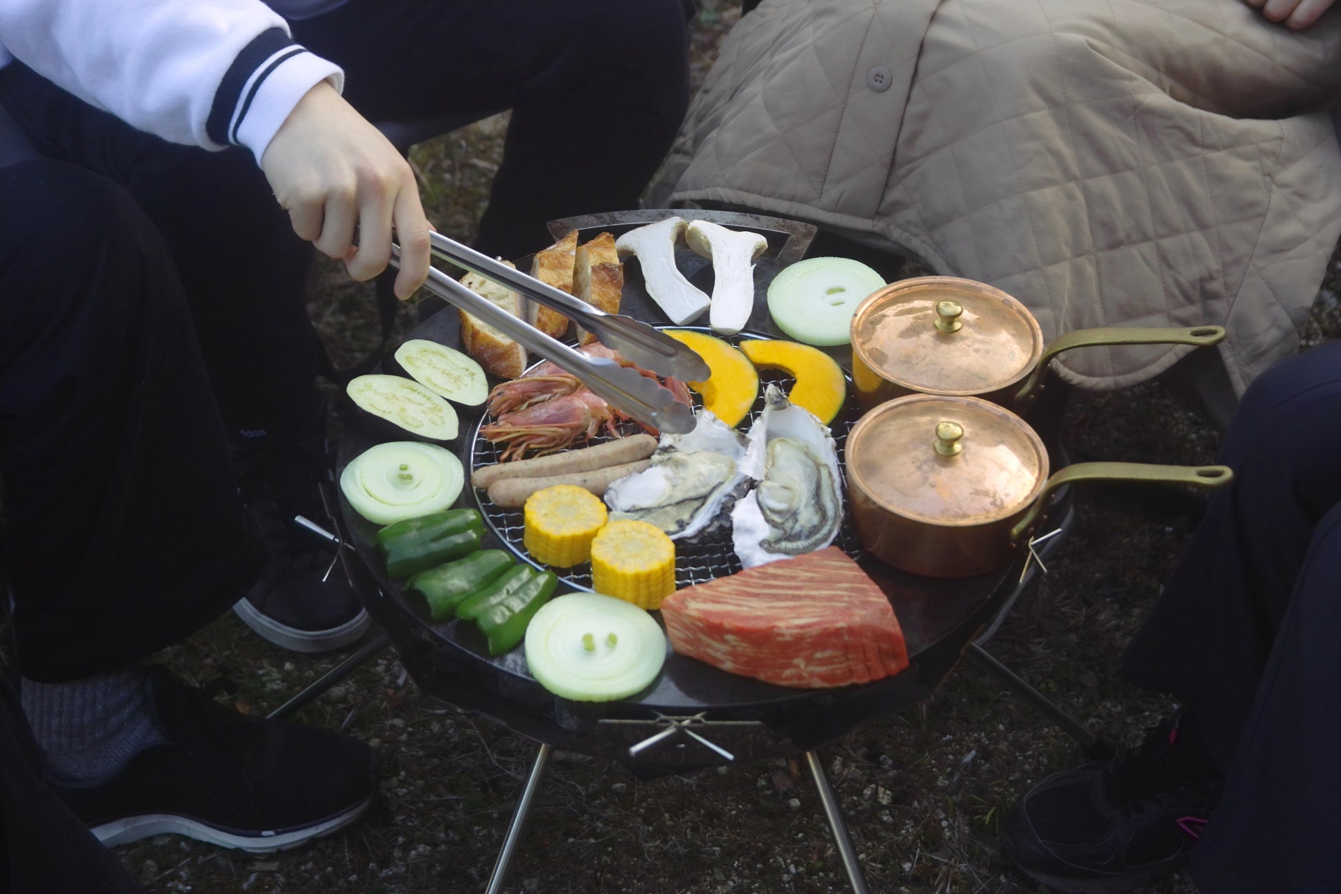 ドーナツ天板の中心で焚き火をすることで天板が熱くなり、すぐに鉄板調理が可能に。熾火になったら中網を置いて炭火焼きを楽しめます。