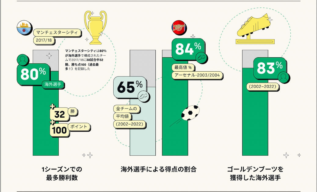 その結果、過去20シーズンのゴール数の64.8%は外国人選手が成し遂げ、ゴールデンブーツを受賞した選手の83%が外国人選手だったことがわかりました。加えて2017年に1シーズンでの最多勝利数を収めたマンチェスターシティは80%が外国人選手で編成されています。