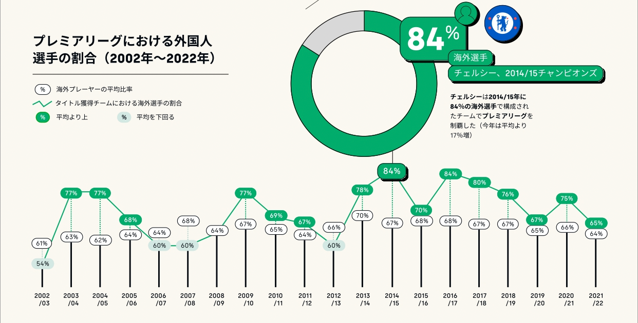 各シーズンでタイトルを獲得した20チームのうち、15チームが平均比率を上回って外国人選手を活用していることがわかりました。特に2014/2015シーズンでプレミアリーグを制覇したチェルシーは、外国人選手の活用比率が84%と、過去20シーズンで最も多国籍なチーム編成をしています。