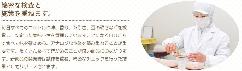 毎日すべてのロット毎に味・香り・糸引き・豆の硬さなどを検査し、安定した美味しさを管理しています。