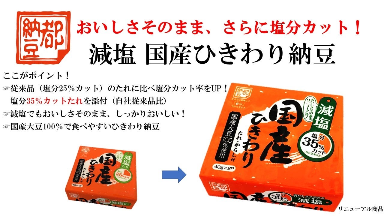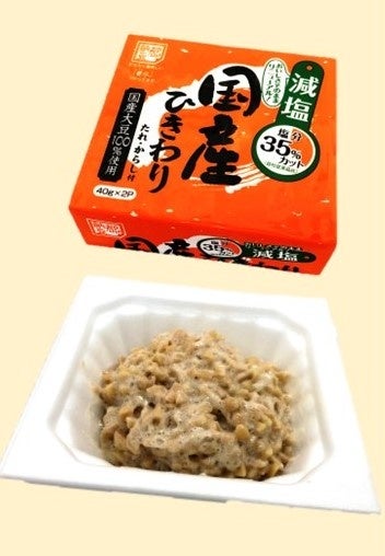 国産大豆を100%使用し、お子様からお年寄りまで幅広く人気のあるひきわり納豆に塩分35%カット(自社従来品比)の減塩たれを添付しました。