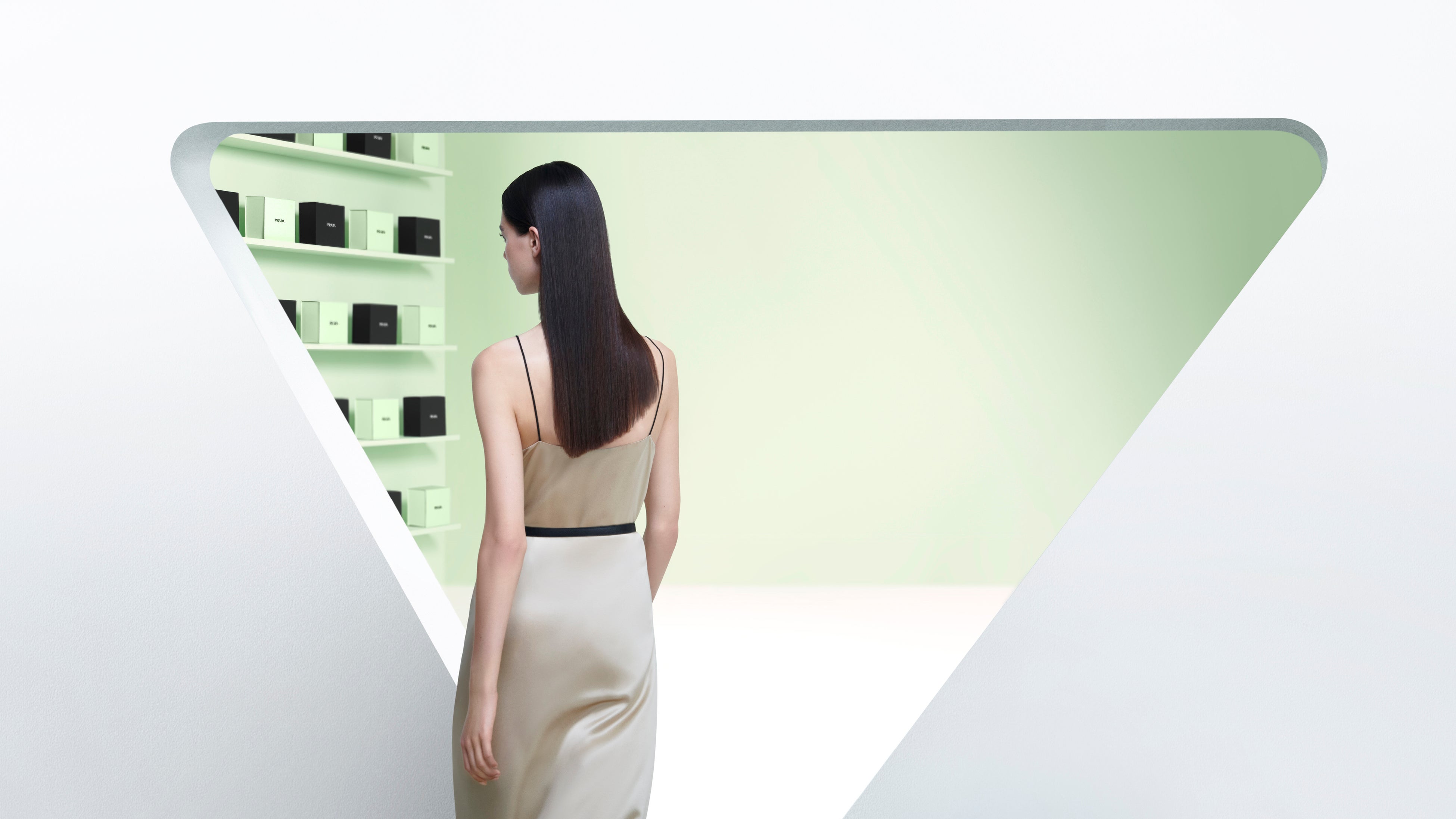 店舗は象徴的なプラダ グリーンを基調とし、ブランドの世界観をお楽しみいただけるデザインです。
