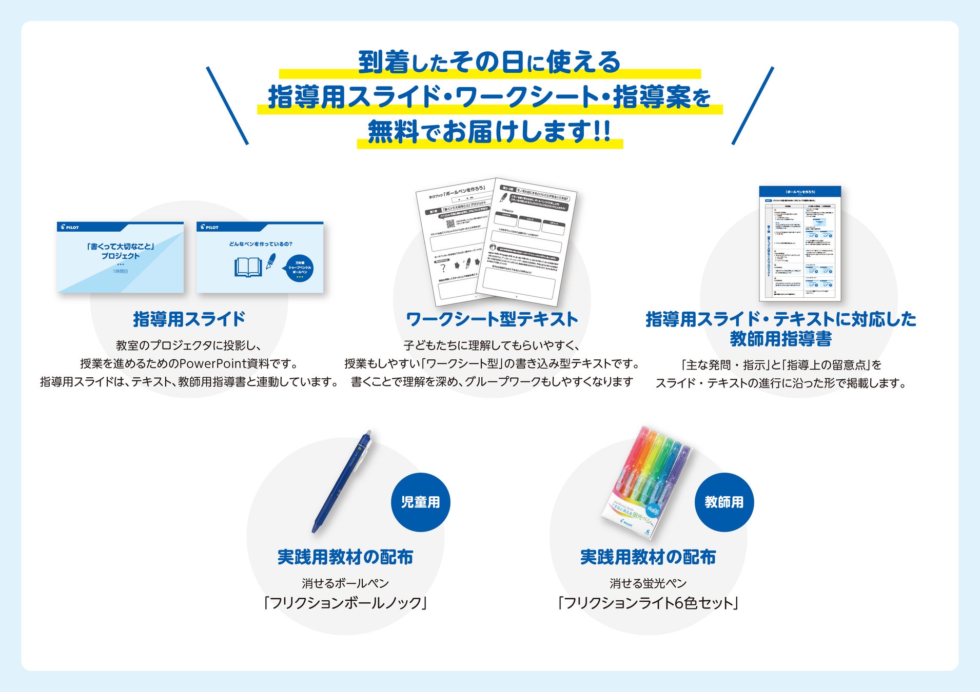 初年度である本年は、授業に参加した児童全員に同社の消せるボールペン「フリクションボールノック」を1本ずつ、授業をする教員には消せる蛍光ペン「フリクションライト6色セット」を、授業での実践用教材として、先着100クラスにお送りいたします。事前予約を受け付けておりますので、奮ってお申込みください。
