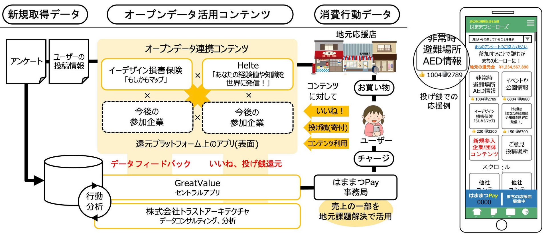 セントラルアプリのポジションとして、自社他社のコンテンツ連携やデータ連携基盤との接続、コンテンツへの投げ銭、はままつPayなどによる収益や売上の一部を地元へ還元する部分を担います。