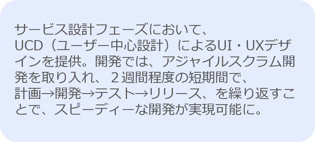 当社の提供するサービスは、日本とベトナムのリソースを融合させ、顧客のビジネスとテクノロジーという両側面からDXを推進する「ハイブリッド型サービス」です。ハイブリッド型サービスにおいては、コミュニケ―ションの仲立ち役である、日本人PMとベトナム人PMの豊富な経験から、従来のオフショアでありがちなコミュニケーションの齟齬などを防ぎます。実際のサービス設計フェーズにおいては、UCD(実際にサービスを利用するユーザーの使い方を元にデザイン・インターフェイスを作成)によるUI・UXデザインを提供し、実装のフェーズではアジャイルスクラム開発を取り入れ、計画、開発、テスト、リリースを繰り返すことにより、高品質かつスピーディな開発を実現します。このように、サービス設計からエンハンスまでワンストップでサービスを提供することで、顧客に貢献いたします。
