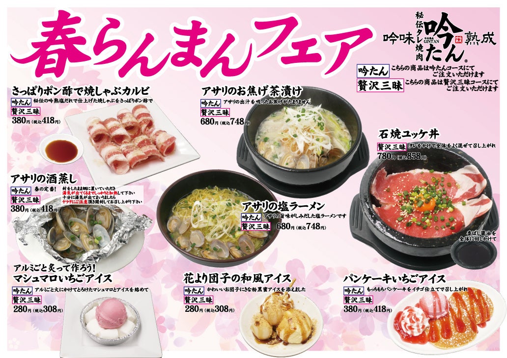 【タッチパネルで注文・配膳ロボットでお届け】の吟たんでは3月4日より【春らんまんフェア】を開催いたします。春が旬のアサリを使ったメニューや焼肉店ならではの焼いて仕上げるイチゴのスイーツ、お団子のスイーツやさっぱり焼しゃぶカルビなど春を感じるメニュー盛沢山です。