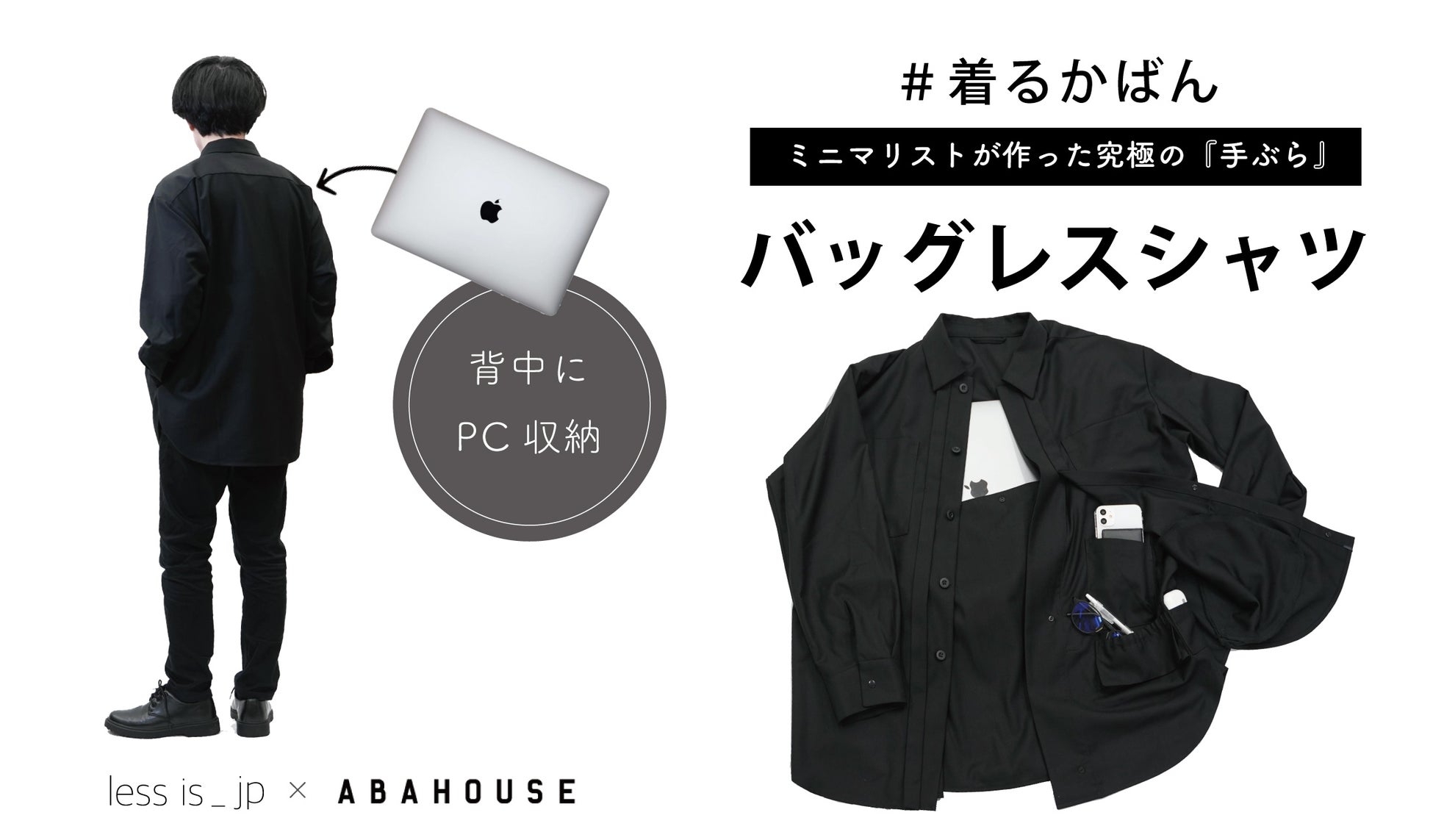 【ミニマリストしぶ×ABAHOUSE】背中にPC、計10個のマルチポケット『究極の手ぶら』を実現する「バッグレスシャツ」予約販売開始