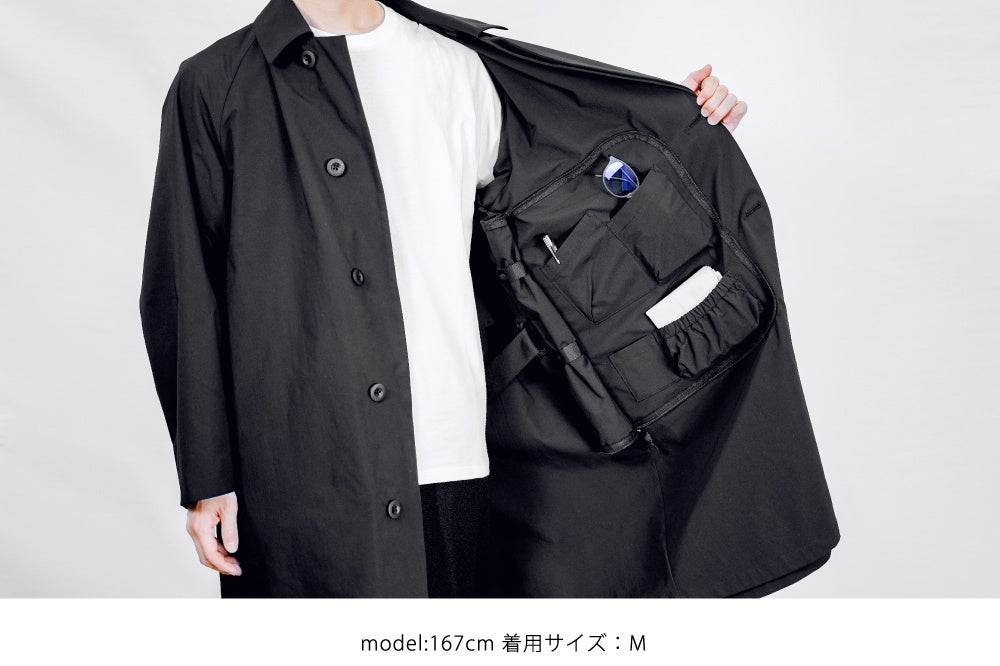 バッグレスシリーズには他にもコートを展開しています。背中にPC、マルチポケットなどの機能はそのままに、1枚で旅行にも行ける収容力抜群な一着。