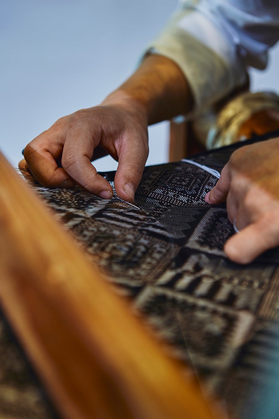 織り上がりの際には、「織り上げ式」として、お客様と織り子が共に鋏を入れ、反物を織機から外します。この鋏入れは、まるで“へその緒を切る”ように、一反の誕生に立ち会う象徴的で神聖な儀式です。お客様自身の手で反物の誕生を迎えることで、その一着に対する愛着はさらに深まります。