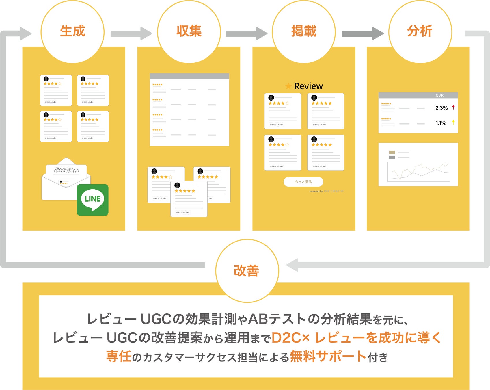 また、レビューの効果検証やABテストなどの分析結果をもとに、改善提案から運用までECのレビューマーケティングを成功に導く専任のカスタマーサクセス担当による無料サポートつきの安価な月額定額制で制限なくすべての機能(レビューの生成・収集・掲載・分析・改善)をご利用いただけます。