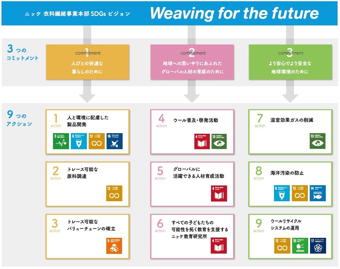 当社は、自然の恩恵を受けた素材である「ウール」の総合メーカーとして生まれ、日本の繊維産業とともに発展し、これまで歩んでまいりました。祖業を受け継ぐ衣料繊維事業本部では、2020年に策定したSDGs方針の中で、そのビジョンを「Weaving for the future(未来を織りなす)」としました。より安心で安全な持続可能な未来へ向け、地球環境の保護・保全に寄与し、掲げた未来を実現する人財育成を支援することを目的とし、その実現のため、3つのコミットメントと9つのアクションを掲げて実行しております。