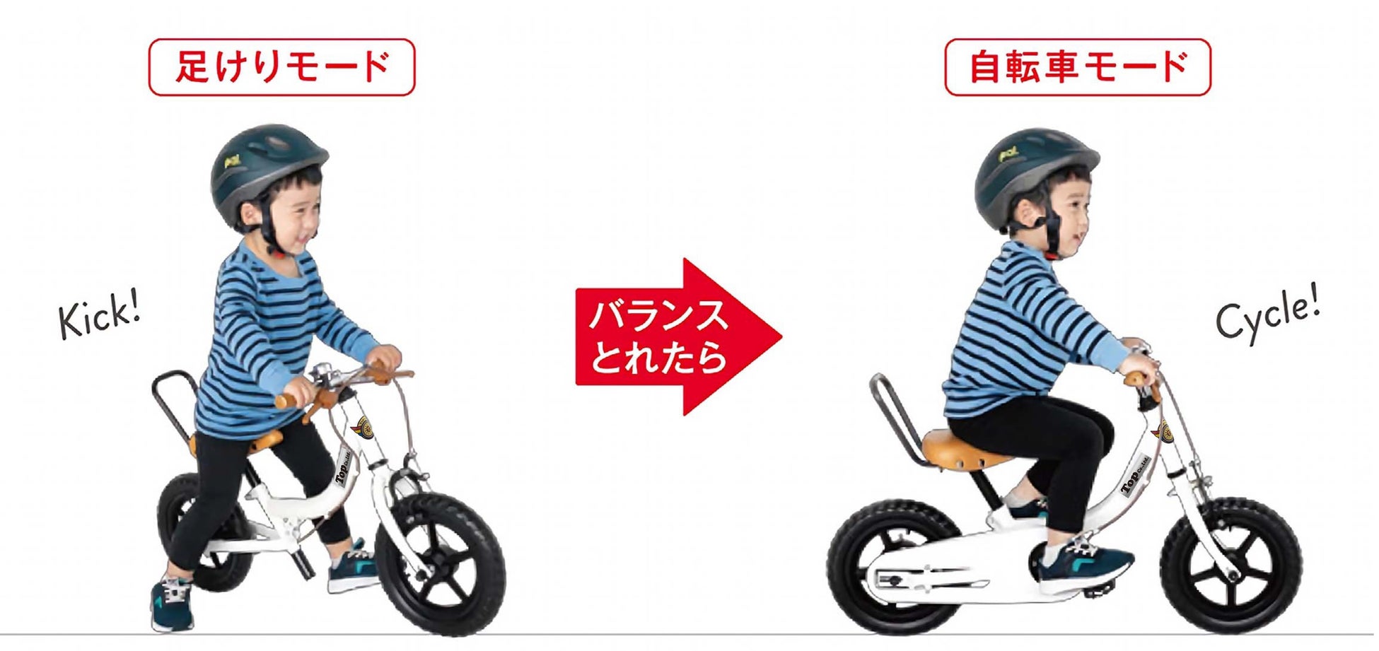 足けりモードからスタートすることで、遊びながらバランス感覚を身につけることができます。バランスがとれるようになったら、ペダルをつけて自転車モードに。乗り慣れた車体で、スムーズに自転車に乗れるようになります。
