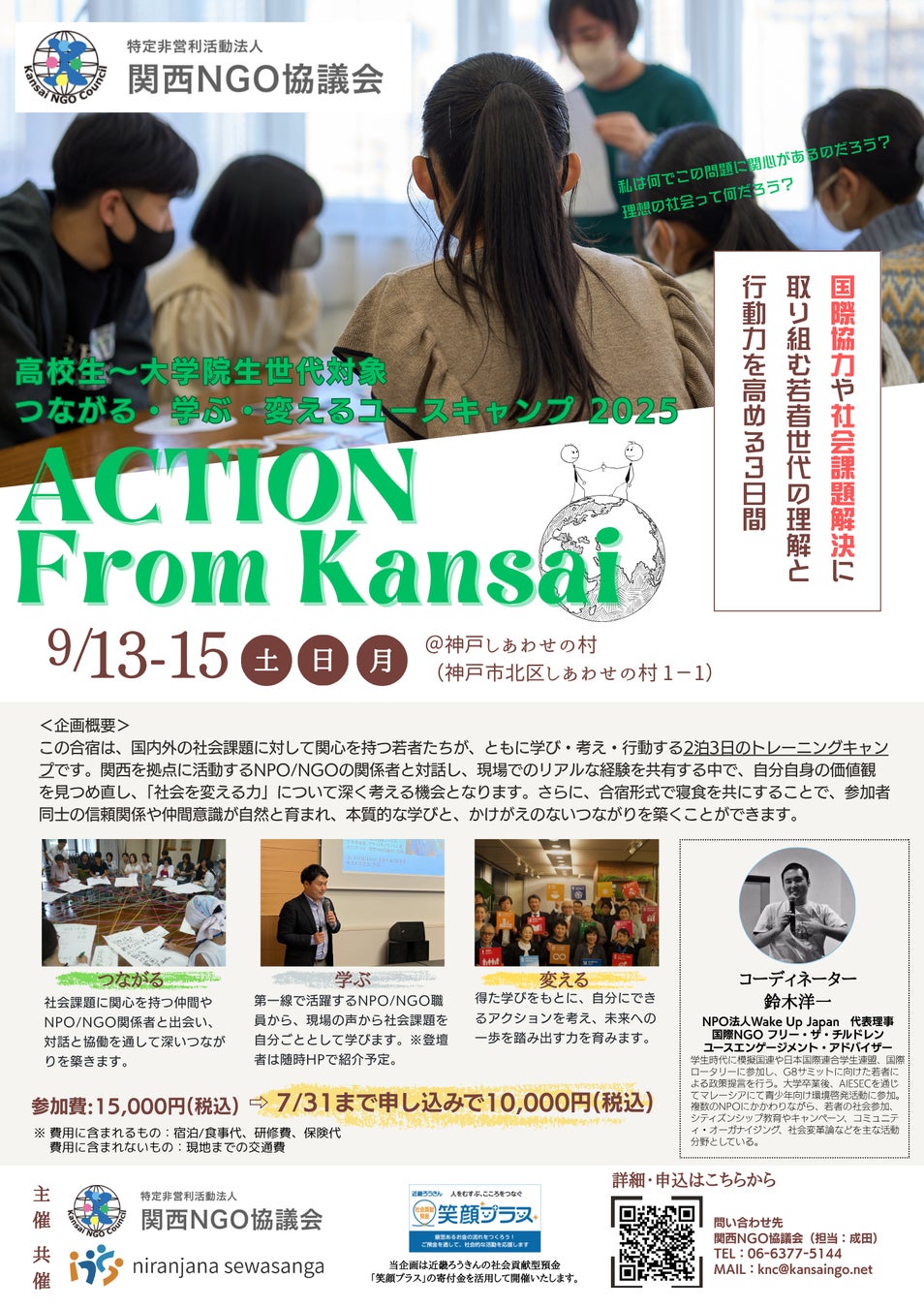 特定非営利活動法人関西NGO協議会(所在地:大阪市、代表理事:三輪敦子)は、特定非営利活動法人ニランジャナセワサンガと共催し、2025年9月13日(土)~15日(月・祝)にかけて、神戸「しあわせの村」にてユース向け合宿イベント「ACTION From Kansai ーつながる・学ぶ・変えるユースキャンプ2025」を共催いたします。