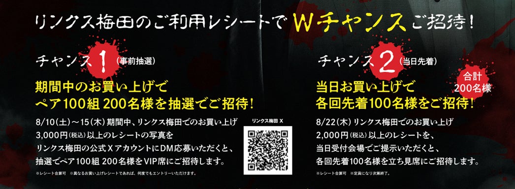 8/10(土)〜15(木)期間中、リンクス梅田でのお買い上げ3,000円(税込)以上のレシートの写真を、リンクス梅田の公式XアカウントにDM応募いただくと、抽選でペア100組200名様をVIP席にご招待します。