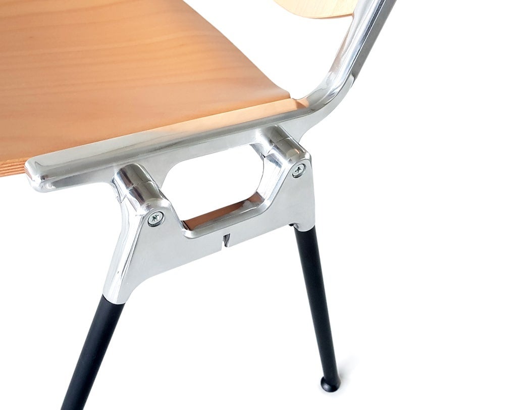 木素材の椅子が主流だったデザイン当時、成型合板の座面・背面をアルミニウム製のフレームで挟み込み、ネジで締め上げて固定する構造が生み出されました。