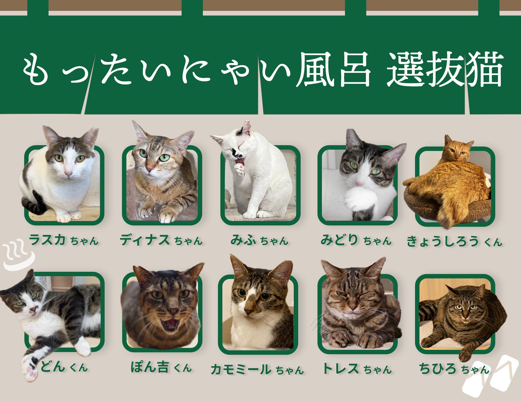 「もったいにゃい風呂」の浴室譲渡会では、参加猫10匹それぞれを印刷したポスターを浴室の壁や待合室に掲示します。通常の譲渡会と異なり、猫の生体展示を行いません。猫に負担をかけない「新しい譲渡会のあり方」を提案する企画です。