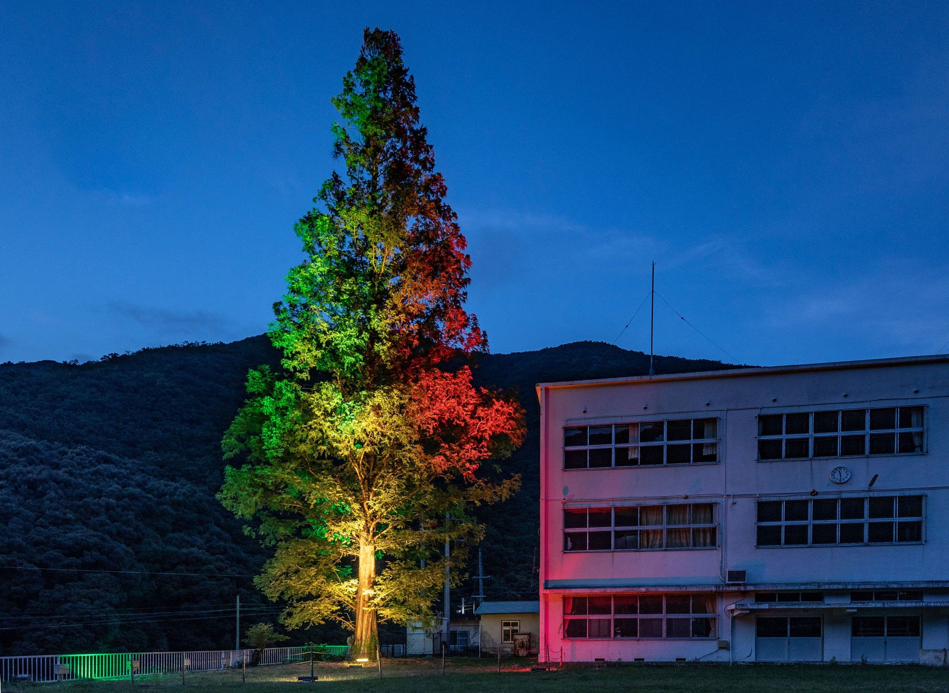 少子高齢化に伴い廃校になった旧真妻小学校の校舎脇にあるメタセコイアをライトアップしたいという相談を受け、2019年にツリーイルミネーションを施しました。そこから改良を加え、2022年に新たにライトアッププロジェクトを行いました。