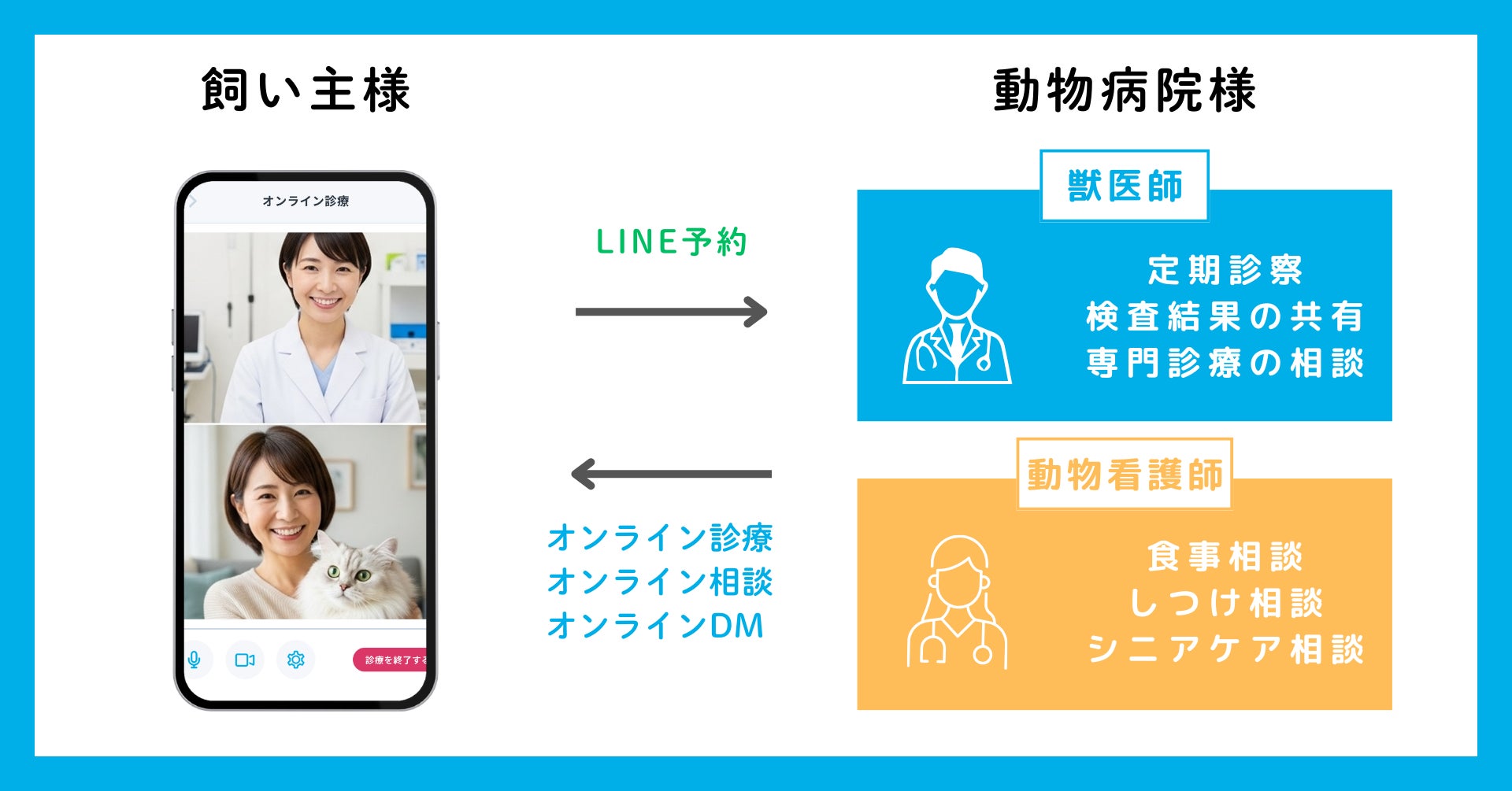 オンライン診療・相談を活用することで、来院だけでは難しかった継続的なコミュニケーションを実現できます。獣医師による「血液検査結果の説明」や「経過観察」「専門診療の相談」に加え、看護師による「食事相談」「しつけ相談」「シニアケアの相談」など、来院とオンラインを組み合わせた柔軟な対応が可能になります。さらに、診療後はWonderのオンラインDMを活用したアフターフォローにより、飼い主様の満足度向上と再診・来院のきっかけをつくり、動物病院の売上増加を狙います。