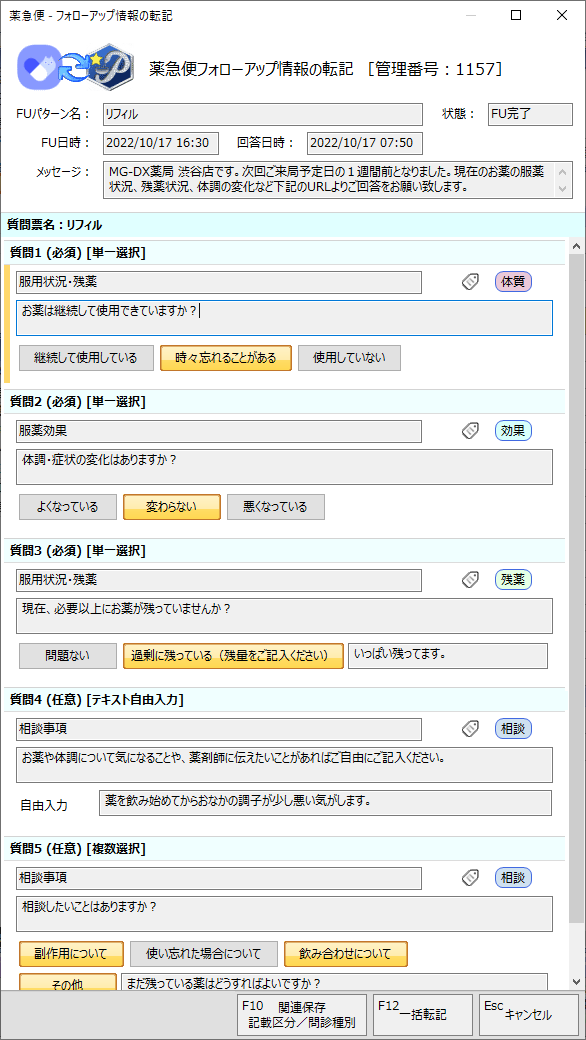 さらに、薬急便で「患者フォローアップ」を実施した際に取得した情報を、Primeの薬歴にそのままコピーすることもできるため、フォローアップにより発生する薬歴記載の負担を軽減することができます。今後、オンライン服薬指導の問診票についても、同様の連携機能リリースを予定しています。
