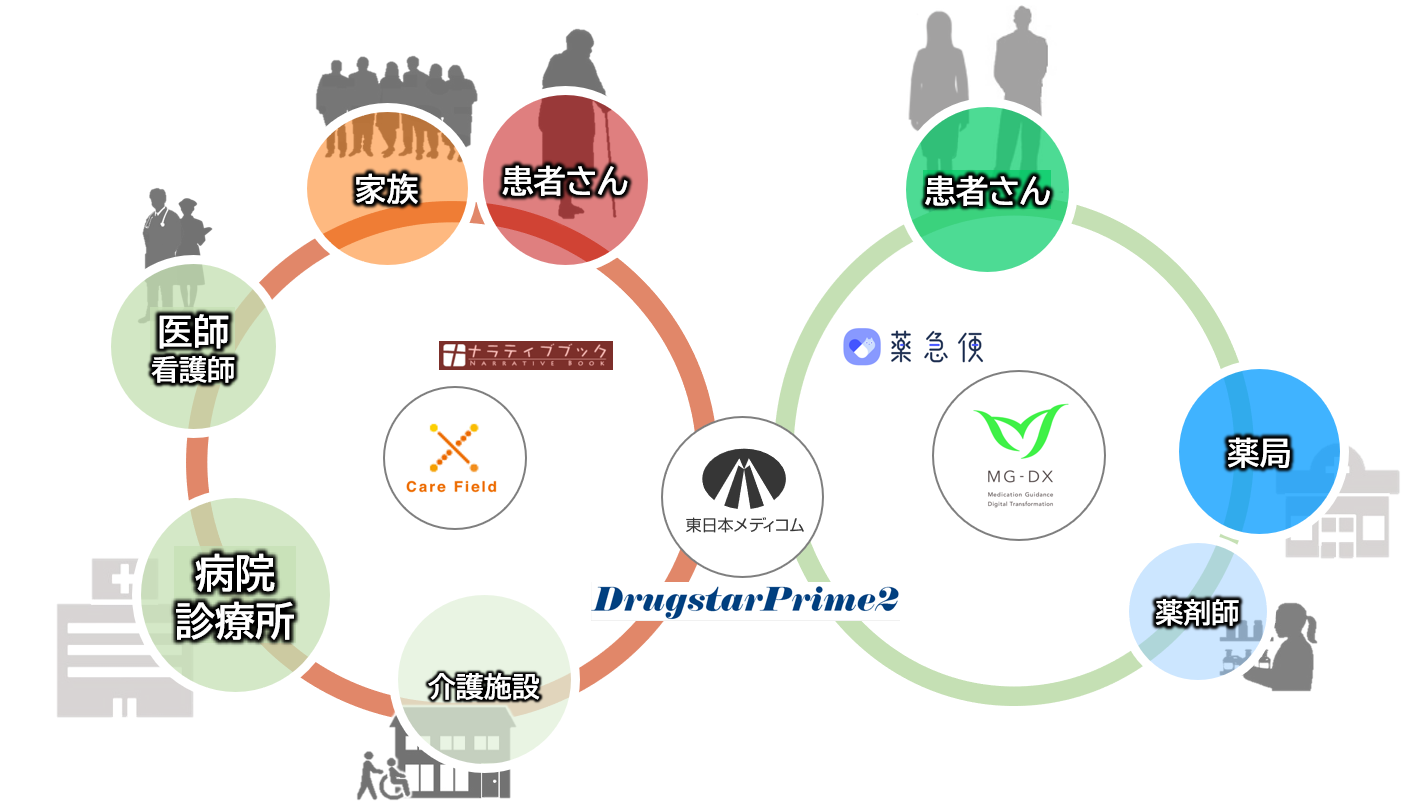 また、東日本メディコムは、クロスケアフィールド株式会社が展開する「地域包括ケア支援システム ナラティブブック」などとも連携し、患者さんの日々の生活情報、多職種が専門的知見に基づいて見守る情報を共有するプラットフォームを構築することで、医療機関・薬局の連携強化と、フォローアップ支援に取り組んでいます。