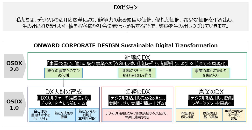 今年度と来年度は、DXの土台として「OSDX」戦略を推進しています。この戦略は、従来の「モノ」のビジネスを超え、「モノ」と「コト」を融合する新たなアプローチを取り入れるためのものです。「Onwardの精神で未来に進みつつ」「Sustainableな地球のための価値を追求」「Digital技術で新しい価値を創出し」「Transformationを通じて新しい変革を導きます」を省略し、「OSDX」戦略と名付けました。