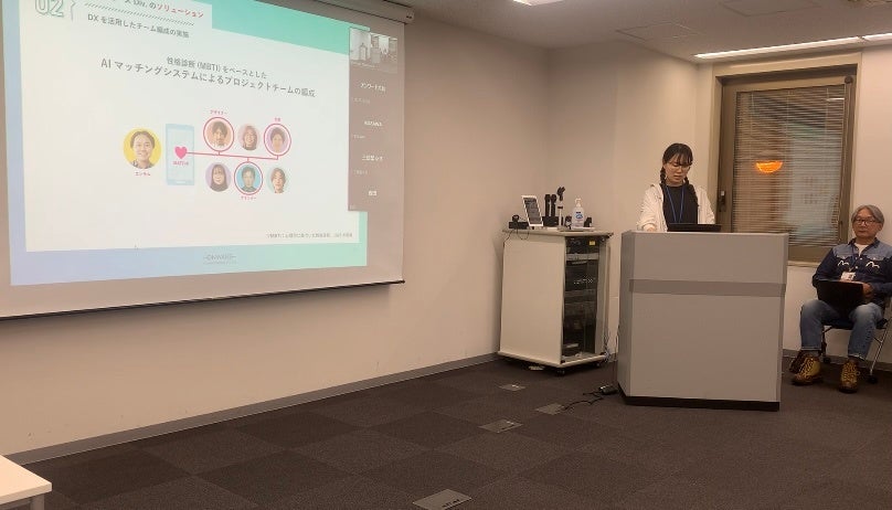成果発表会では、称賛アプリと社内の自動販売機の紐づけや、社内副業マッチングアプリ等のアイデアが出て、「テーマに合致しているか」、「新規性・独創性があるか」「社内へのインパクトがあるか」「実現性があるか」の4つの評価項目をもとに、社長、各グループ長、社外の専門家が評価を行いました。最優秀に選ばれたのは、若手社員間のスキルの差を課題と捉えて、性格診断を用いたマッチングシステムの導入を提案したチームで、他の案も含め、具現化に向けた検討が始まっています。