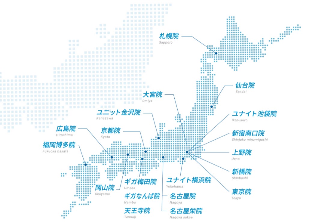 当グループは提携院を含め、北海道(札幌)、東北(宮城・仙台)、関東(東京、埼玉、神奈川)、北陸(金沢)、中部(名古屋、栄)、関西(大阪、京都)、中国(広島、岡山)、九州(福岡・博多)と全国に19院展開しております。