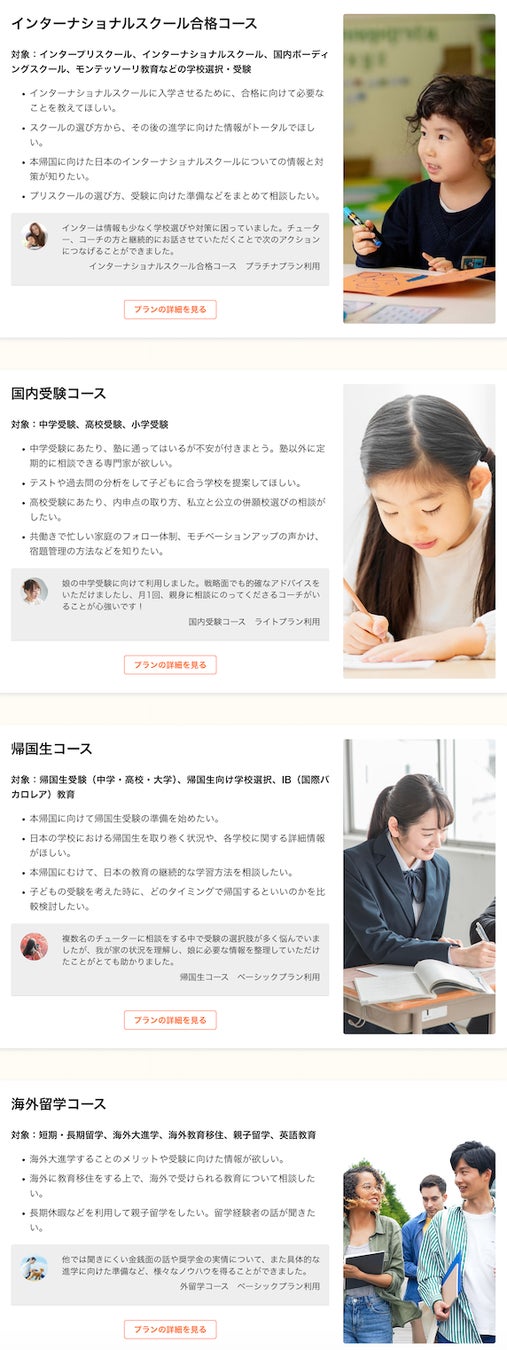 国内外からの受験準備を毎月サポート。プラチナプランでは専属コーチだけでなく、日本のインターに精通する専門家が特別に専属チューターとしてサポートいたします。