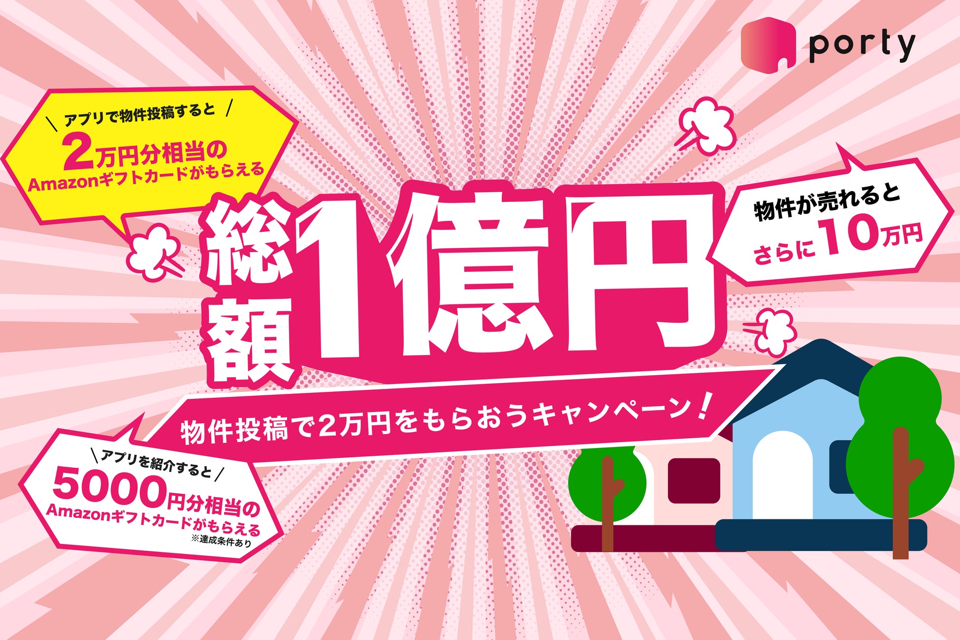 株式会社ポルティ(神奈川県川崎市、代表取締役:平瑶平、以下「ポルティ」)は、昨年12月に発表した空き家の所有者と買い手を繋ぐマッチングアプリ「ポルティ」の正式リリースを記念して、アプリ内での物件投稿や物件売却、アプリの紹介へ特典を付与する「総額1億円!物件投稿で2万円をもらおうキャンペーン!」を1月20日より開始します。