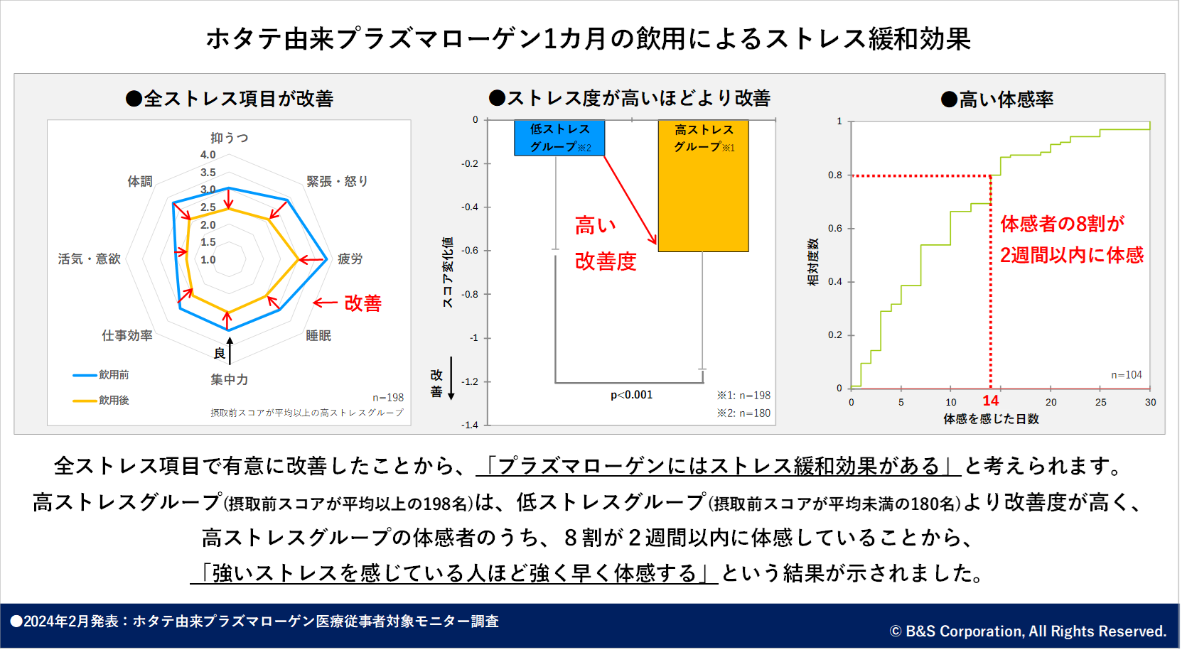 【ホタテ由来プラズマローゲン1カ月の飲用でストレス項目が改善】ストレスが高い人ほど改善度が高く、体感者の8割が2週間で体感