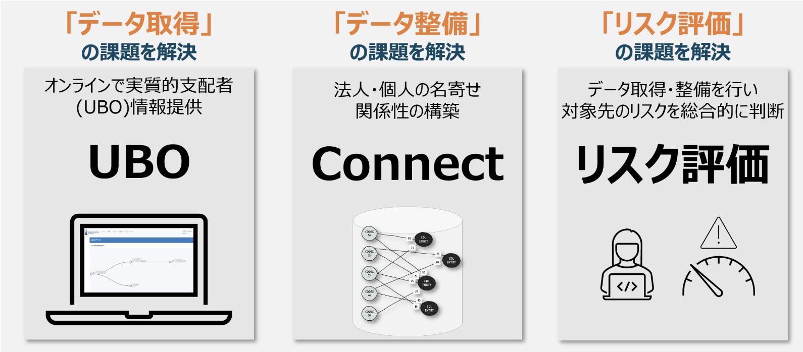 CDLは、情報ソースの拡充に加え、従来の情報検索において、類似名の判別が困難である、検索対象と関連する企業や人の特定が困難である、といった「顧客の背後のリスクが見えない」という課題を解決し、膨大なデータの中で、人・企業が関連付けされ、「顧客の背後までリスクが見える世界」を実現します。