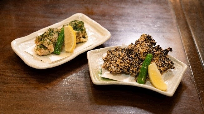 究極のから揚げのポイント:食感と味わいの個性を楽しめる2種類のから揚げです。液体塩こうじを鶏肉に揉み込むことで、柔らかくジューシーなから揚げに仕上がります。味付けは液体塩こうじだけで完結し、磯辺揚の青のりの風味、利休揚げの白胡麻・黒胡麻の香ばしさがアクセントを加えます。